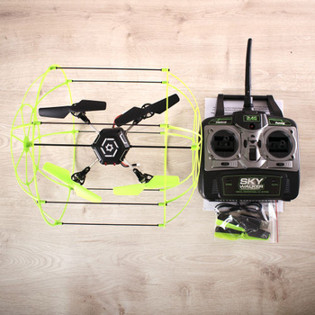 Небольшой квадрокоптер SkyWalker HM1306 выполняется из прочного и очень легкого материала. Основная его особенность – это наличие съемного каркаса. Он не только защищает летательный аппарат от повреждений, но и наделяет его новыми возможностями. Цилиндрический каркас, внутри которого находится квадрокоптер SkyWalker, поворачивается вокруг своей оси. Это позволяет коптеру ездить по полу, стенам и даже потолку.