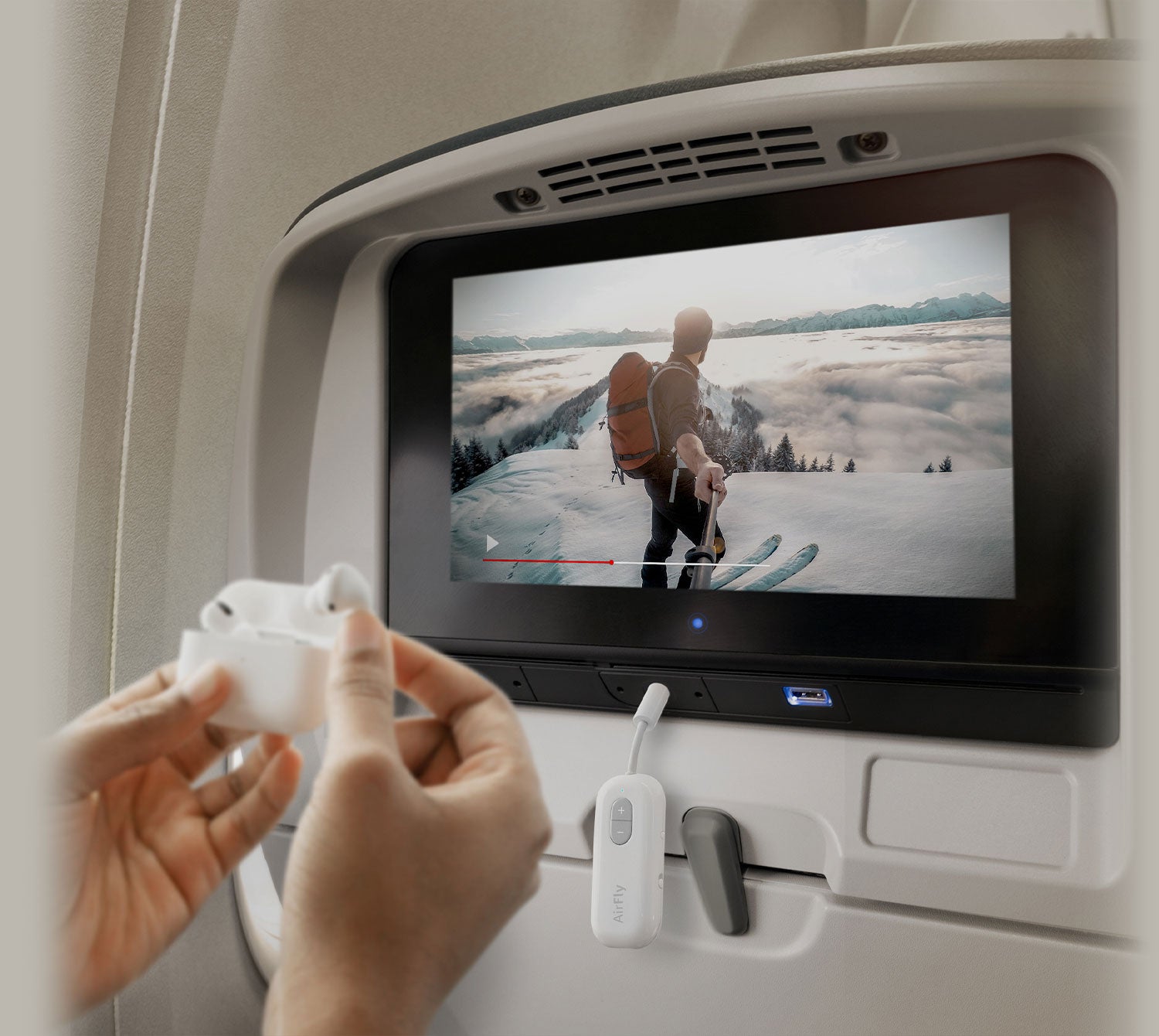 AirFly SE is the most affordable way to listen to in-flight movies with your wireless headphones or earbuds. AirFly SE has a 20+ hour battery and a battery indicator so you know when it’s time to recharge. New Volume controls let you turn sound up or down without touching the seat back screen. Mute the sound with two taps when the beverage cart arrives. Sounds great, doesn’t it?
