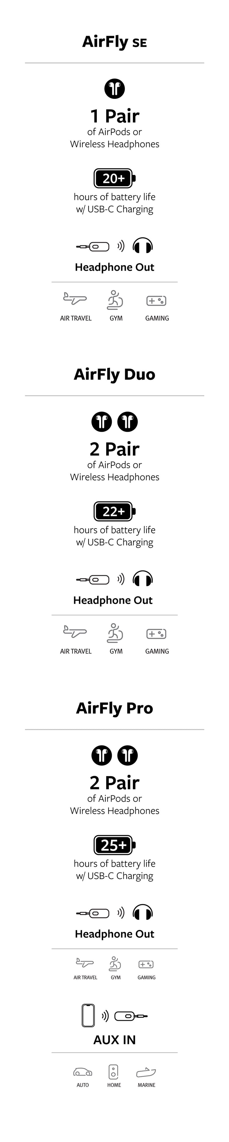 AirFly Duo and AirFly Pro allow two people to listen to the in-flight movie on an airplane or an Apple TV show on your MacBook Air, MacBook Pro or iPad Pro with their wireless headphones. Both AirFly Pro and Duo work with most popular wireless headphones and earbuds, and with any combination of wireless headphone brands.
