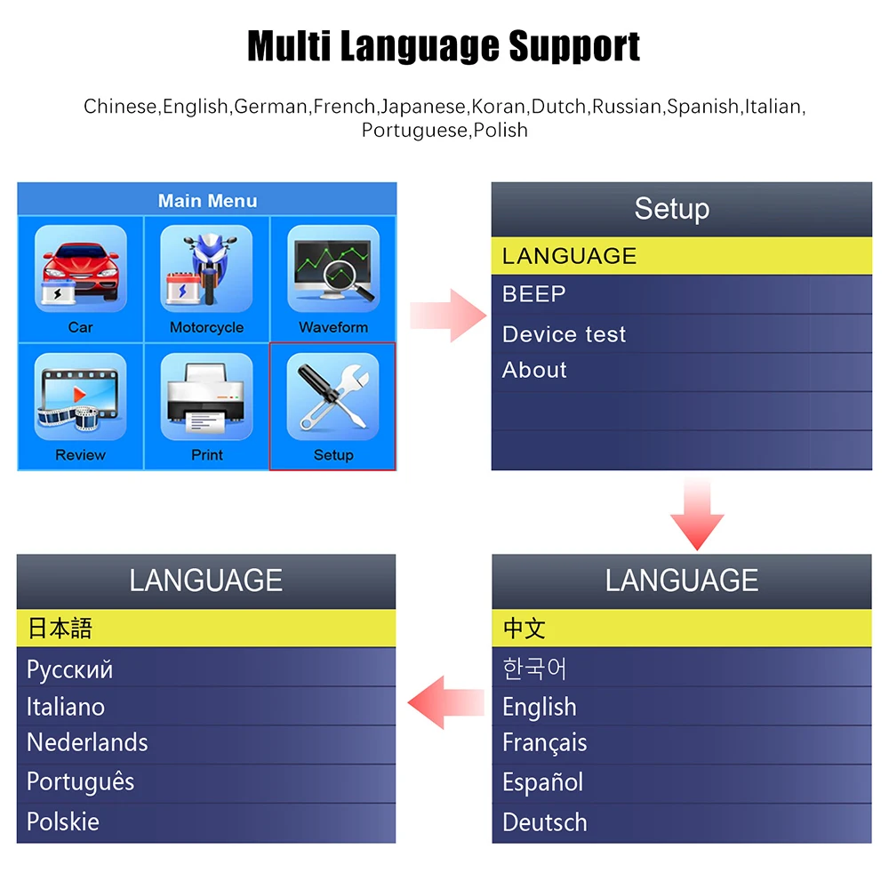 Chinese, English, German, French, Japanese, Korean, Dutch, Russian, Spanish, Italian, Portuguese, Polish