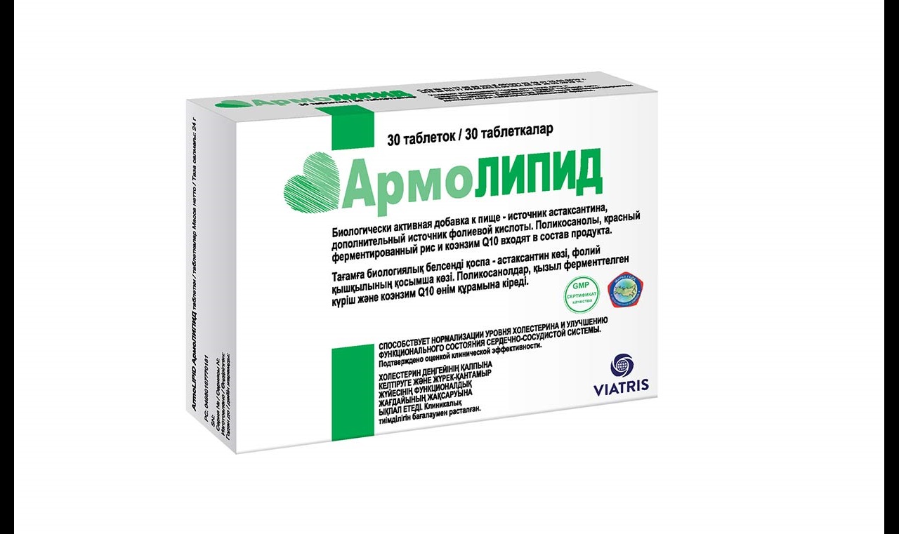 «АрмоЛИПИД» рекомендуется в качестве диетической добавки для коррекции рациона диетического питания — источник антиоксидантных витаминов. Активные вещества: Красный ферментированный рис является источником монаколинов, которые идентичны статинам, ингибирует фермент ГМГ-КоА-редуктазу. Поликосанол увеличивает количество рецепторов липопротеидов низкой плотности, повышает обратный захват холестерина плазмы, ингибирует синтез ГМГ-КоА-редуктазы, оказывая тем самым гипохолестеринемический эффект. Коэнзим Q10 — антиоксидант, регенерирующийся организмом; участвует в синтезе АТФ, предотвращает митохондриальную дисфункцию, а также уменьшает риск возникновения статин-индуцированной миопатии. Астаксантин блокирует свободные радикалы в клеточной мембране, препятствует трансформации окисленных липопротеидов низкой плотности в атероматозные агенты. Фолиевая кислота снижает риск образования тромбов, способствует превращению гомоцистеина в метионин.
