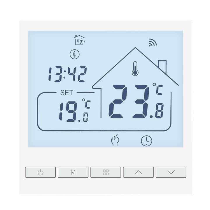 Сам термостат — это небольшая прямоугольная коробочка с сенсорными кнопками управления и дисплеем.