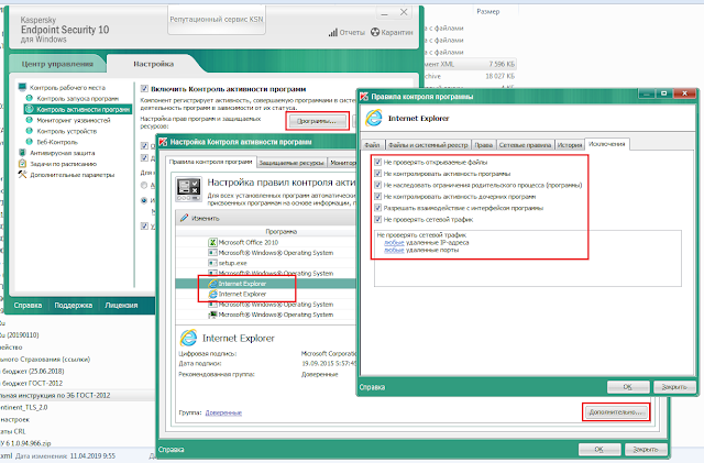 Настраиваем Антивирус. В сети рекомендуют отключать антивирус совсем. Отличная шутка, особенно на компьютере управляющем деньгами. Предлагаю настройки для Kaspersky Endpoint Security 10. На других антивирусах нужно создать подобные правила.