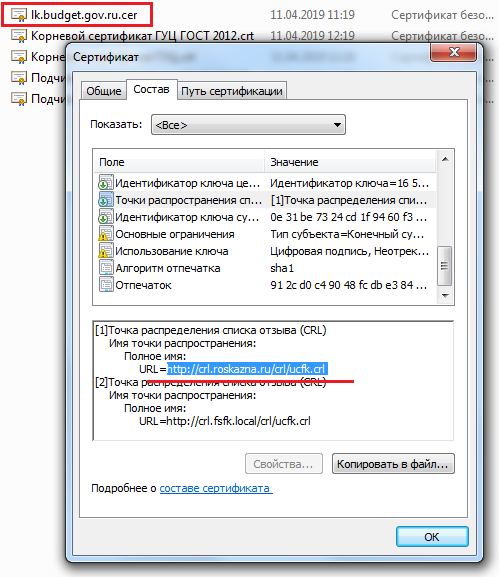 Жамкаем дважды в Проводнике на проблемный сертификат. Переходим на вкладку «Состав» и выбираем строку «Точки распространения списка отзыва (CRL)». Получаем адреса… Запускаем любой интернет-браузер и вбиваем URL. Если «пусто» по всем адресам, ну чтож — мертворожденный…