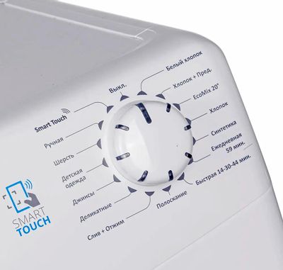 После выбора режима требуется включить интерфейс NFC на смартфоне и приложить его к логотипу «Smart Touch» на панели управления. Машина издаст звуковой сигнал и начнет стирку.