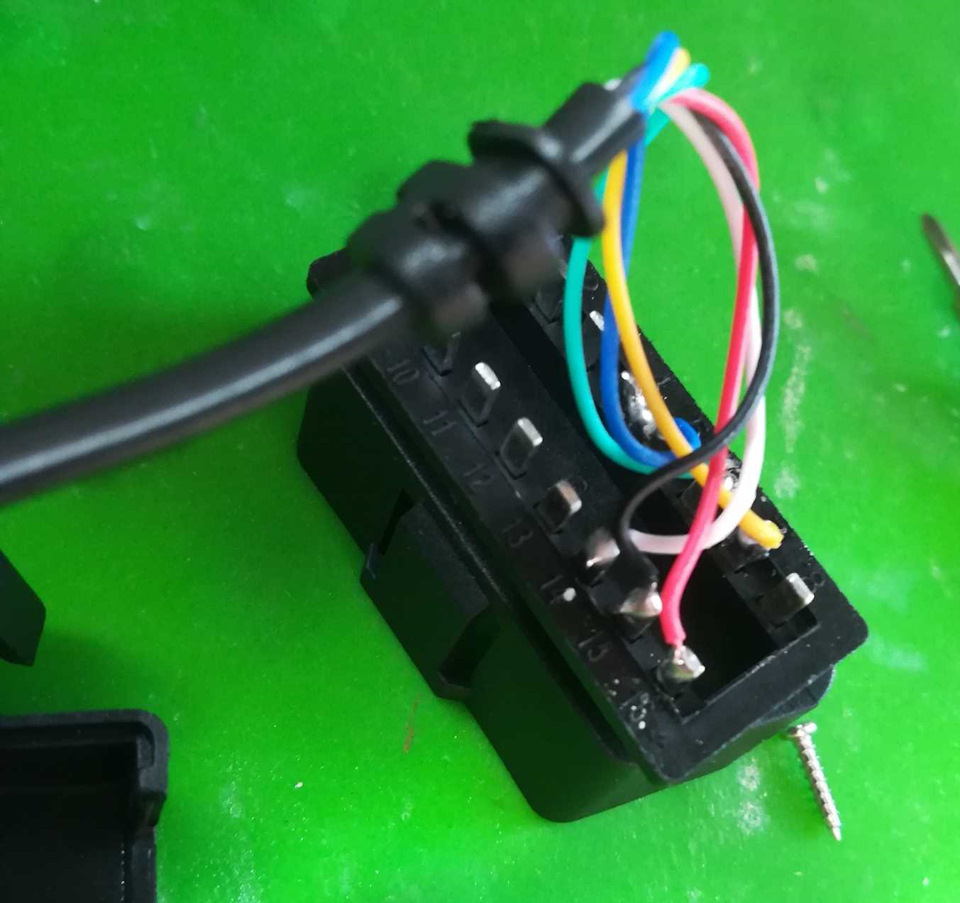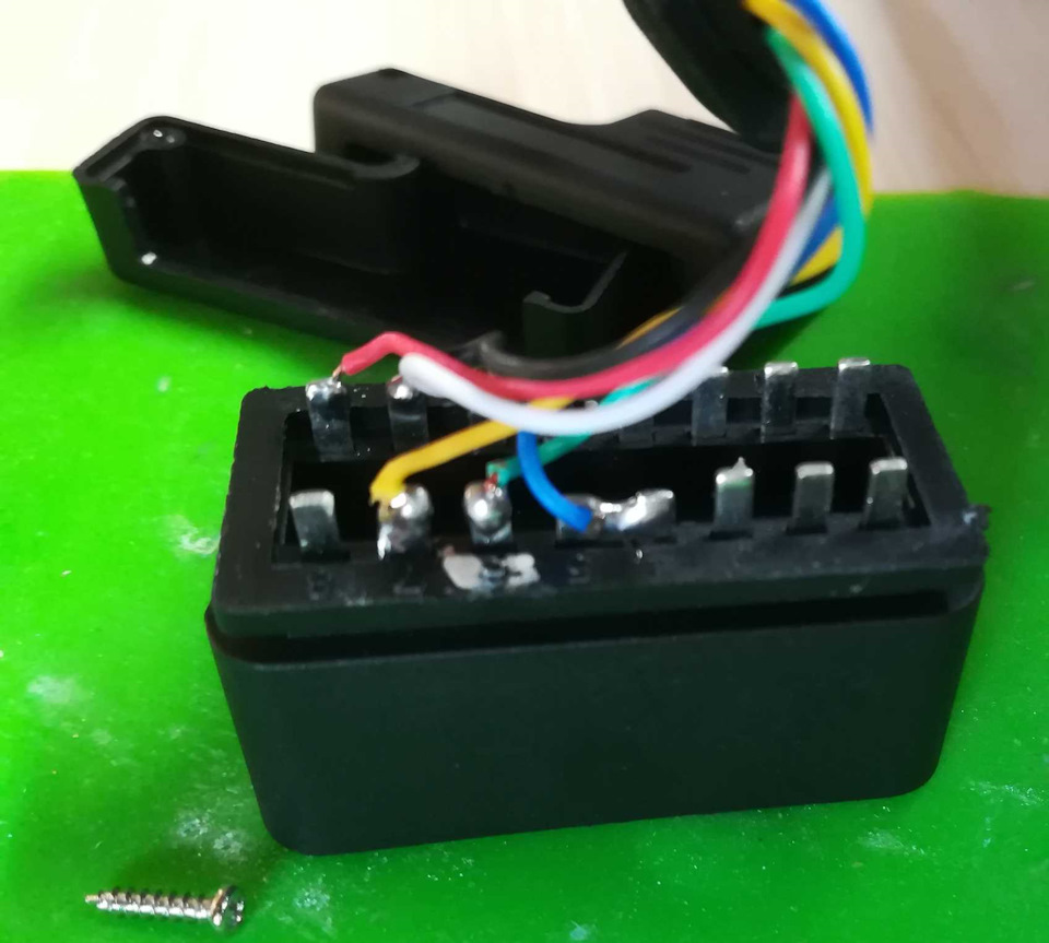 Давайте к делу. У нашего 16pin разъема расшиты только определенные провода. Нам для диагностики (и подключения проектора) достаточно только +, — и K-line. Я разобрал 16pin разъем интерфейсного кабеля проектора (2 шурупа), отпаял лишние провода (изолировал термоусадочной трубкой), согласно схеме, фотографиям и подписям под ними. Номера пинов на разъеме подписаны, там не ошибетесь: