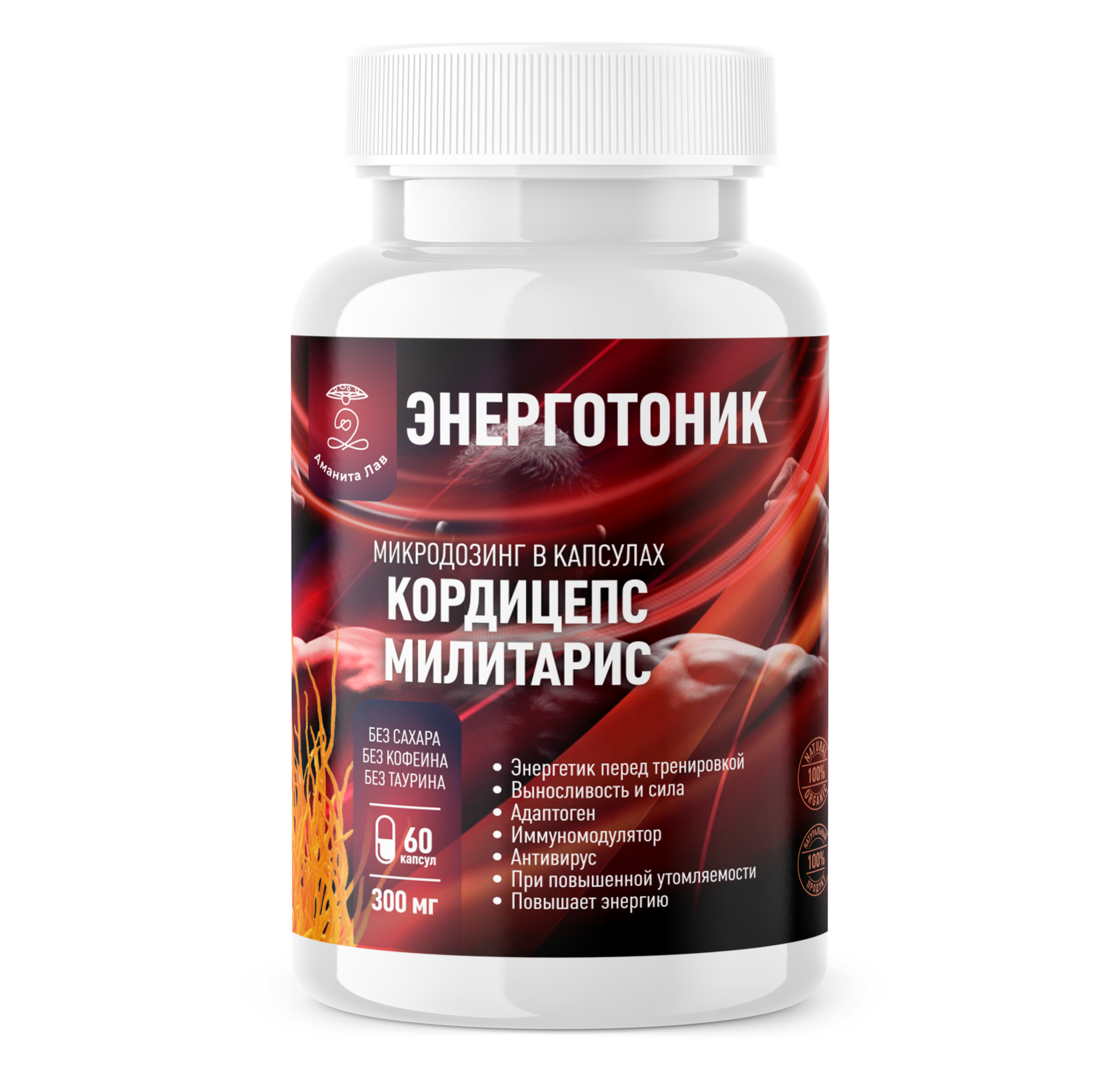 Внутри запас на 3 месяца 180 капсул по 0.3 гр порошка из мицелия Cordyceps militaris