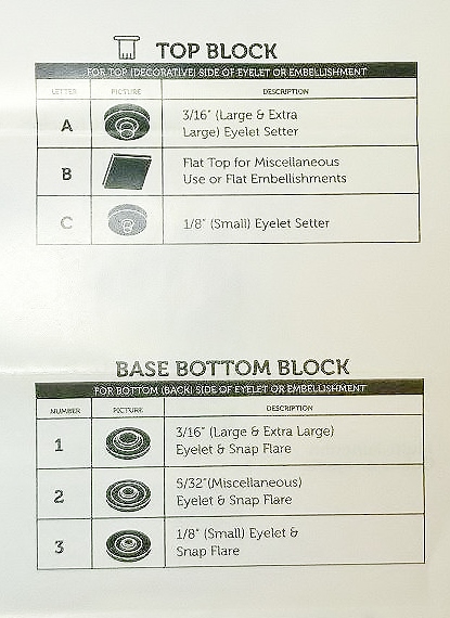 Для установки кнопок или люверсов нам понадобятся два черных крутящихся «барабанчика» — . У основания одного вы увидите написано BASE (для ножки люверса или кнопки, на самом черном квадратике написаны буквы для обозначения разных функций) и изображение шляпки люверса (на квадратике обозначены цифры для обозначения разных видов шляпок у люверсов и кнопок)