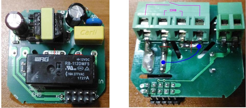 Разбираем. Находим реле. Отрезаем от замыкающих контактов реле все дорожки, кроме тех, что идут на разъём. Но внимательнее! Дорожки могут подходить с разных сторон одновременно. Потом прозваниваем на предмет оставшихся связей. И в заключении соединяем эти контакты с разъёмом. Процесс показан на фото (красным – перерезать, синим – припаять). В результате реле осталось на своём месте в разъёме, но теперь не выдаёт 220В, а просто коротит контакты, что и требовалось.