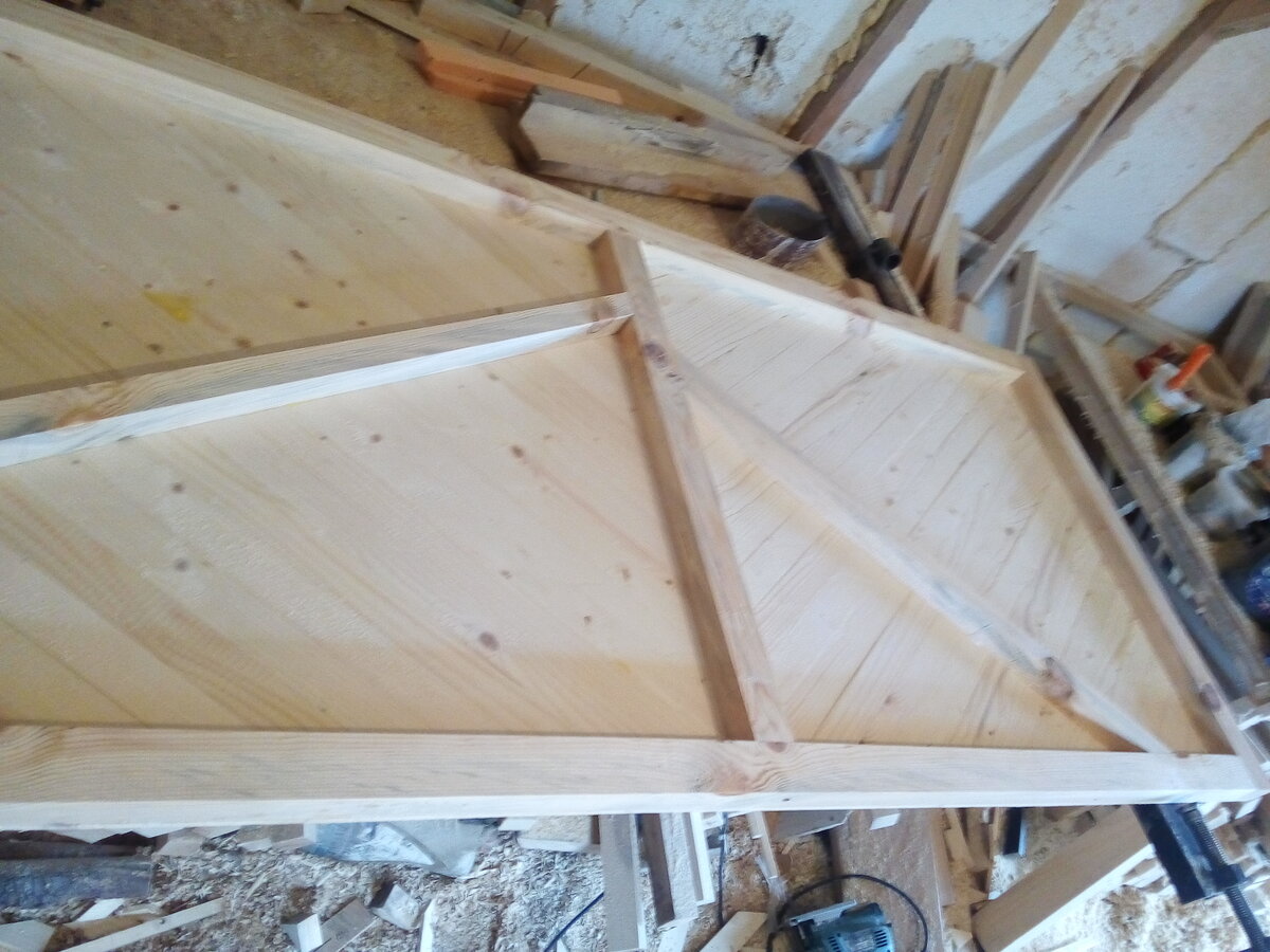 После этого отпиливаем по размеру деревянные бруски размером 50х50 мм и собираем каркас для двери.