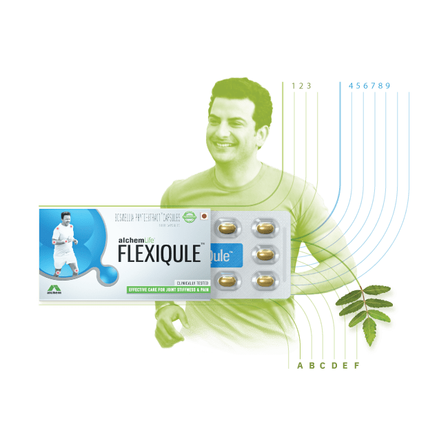 - FlexiquleTM contains a clinically tested combination of the powerful Phyto-actives of Boswellia Serrata & Ginger.