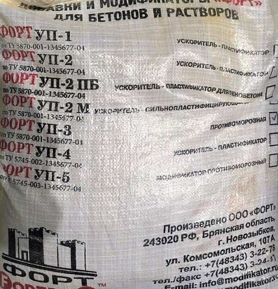 Комплексная противоморозная добавка для бетонов, сроительных растворов и пенобетона УП — 3 (торговая марка «Форт УП — 3», выпускается по ТУ 5870-001-13453677-2004 .) Форт «УП-3»— Ускоритель противоморозный для зимнего бетонирования, пластификатор для плавного набора прочности без резкого схватывания, является многокомпонентным сбалансированным комплексом, который применяется для производства всех видов работ методом зимнего бетонирования. В связи с наличием в составе пластифицирующего компонента «УП-3» заметно улучшает пластичность бетонной смеси, что позволяет транспортировать растворы и бетонные смеси на расстояние более 50 км и укладывать в опалубку для последующего твердения. Обеспечивает нормативный набор прочности бетонов, при производстве работ в зимних условиях и при производстве сборных бетонных и железобетонных конструкций и строительных растворов различного назначения согласно ГОСТ 24211-03(Таблица 1, п.3.1). Область применения добавки — все виды бетонных изделий и железобетонные изделия без преднапряжённого армирования. Добавка работает со всеми видами бетонов и пенобетонов. Добавка ФОРТ «УП-3» относится к противоморозным добавкам и рекомендуется к применению при производстве бетонных работ в условиях пониженных температур окружающего воздуха (до -20° С) Дозировка добавки в % от массы цемента в зависимости от температуры: