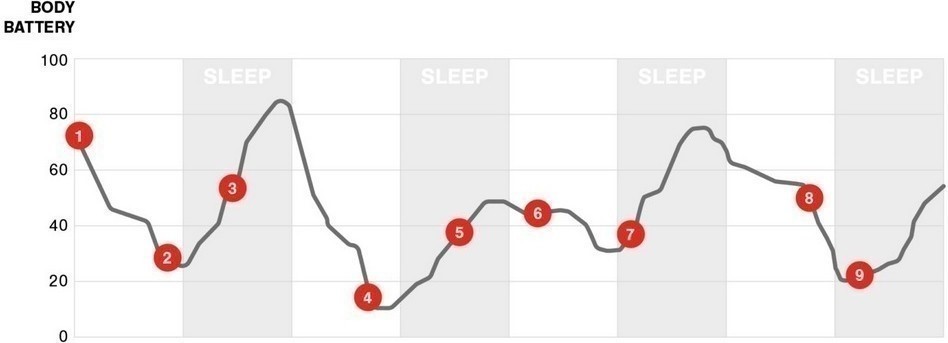 Этот показатель, как правило, максимальный сразу после пробуждения и снижается естественным образом по мере работы и нагрузки организма. Оценка энергетического состояния поможет управлять продолжительностью и интенсивностью тренировок или, наоборот, понять, что пора притормозить и набраться сил.