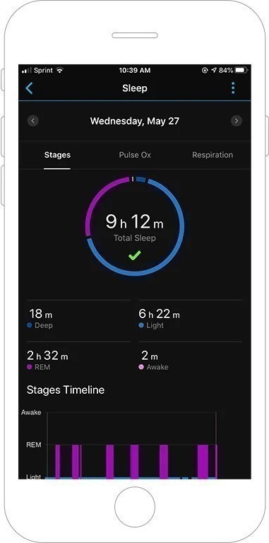 Встроенные датчики получают информацию о дыхании и насыщении крови кислородом, на основании которой можно получить представление о том, как вы спите. На круговой диаграмме отображается разбивка отдыха по стадиям: легкий, глубокий и быстрый сон.