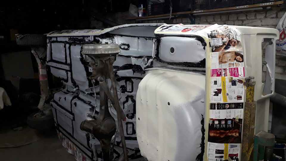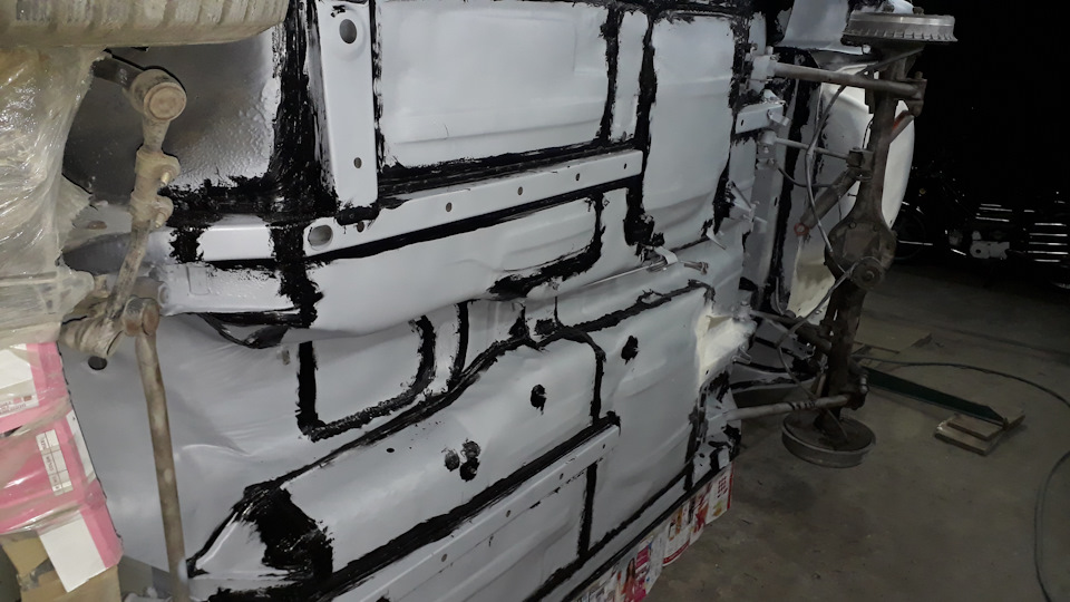 Изначально склонялся к обработке герметиком для кузова, до этого разводил его антисиликоном, что не очень-то бюджетно(хотя обработка герметиком само по себе не бюджетно), а здесь, решил поэксперементировать с бензином и все получилось, герметос становился все реже и реже.Для нормального распыления, долго игрался с пропорциями, в итоге вышло на 1кг герметика, 500-550грамм бензина.Что-то, забежел, я, немного в перед, в общем, после пескоструя, днище было покрыто эпоксидным грунтом, швы обработаны герметиком в тюбиках по 300мл.Последних ушлочетыре с половиной тюбика(1200грамм), а основного, кистевого 6,5кгПосле, разведенным «Боди999» с пистолета, а еще после, со старых запасов(жалко пропадает)Боди930, но это уже так, для поддержки трусов.А завтра приступаю к внутренней части днища.