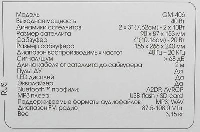Колонки GINZZU GM-406 представляют из себя аудиосистему формата 2.1 с максимальной мощностью в 40 Вт. Аудиосистема поддерживает подключение по Bluetooth, воспроизводит записи с USB-накопителей и SD-карт памяти, а также имеет встроенный FM-приемник. Корпус сабвуфера изготовлен из МДФ, что положительно скажется на качестве баса. Инструкция на русском языке (руководство пользователя) в комплекте.