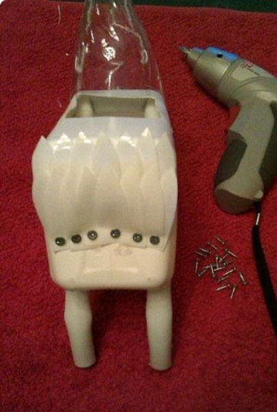 С помощью саморезов, начинаем закрывать заднюю часть нашей формы. Следующим этапом, начинаем закрывать бока канистры снизу, чтобы перья, как бы выходили из под пушистой части «ляжечки».