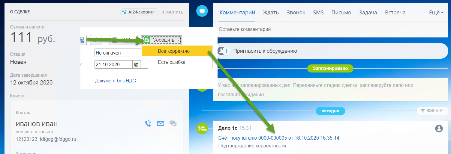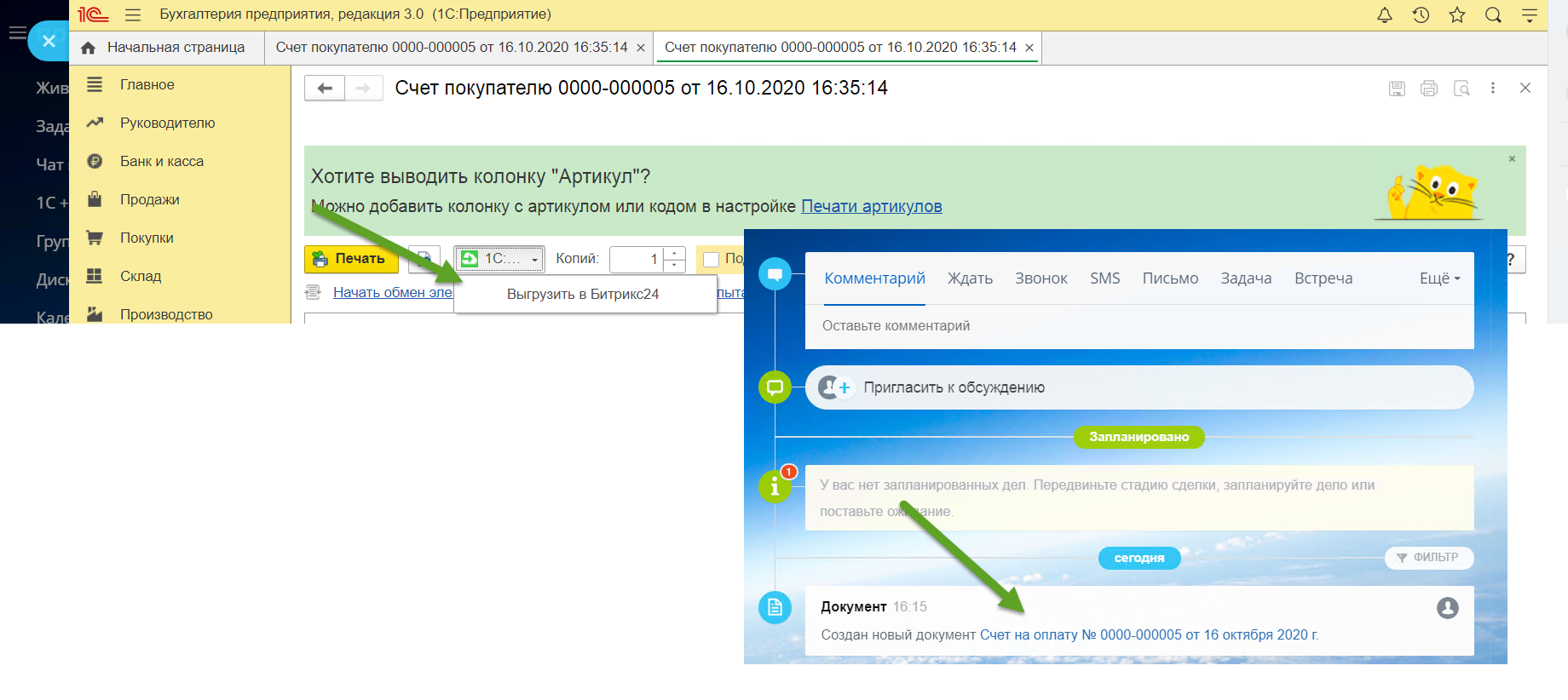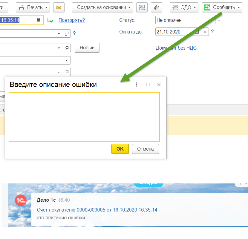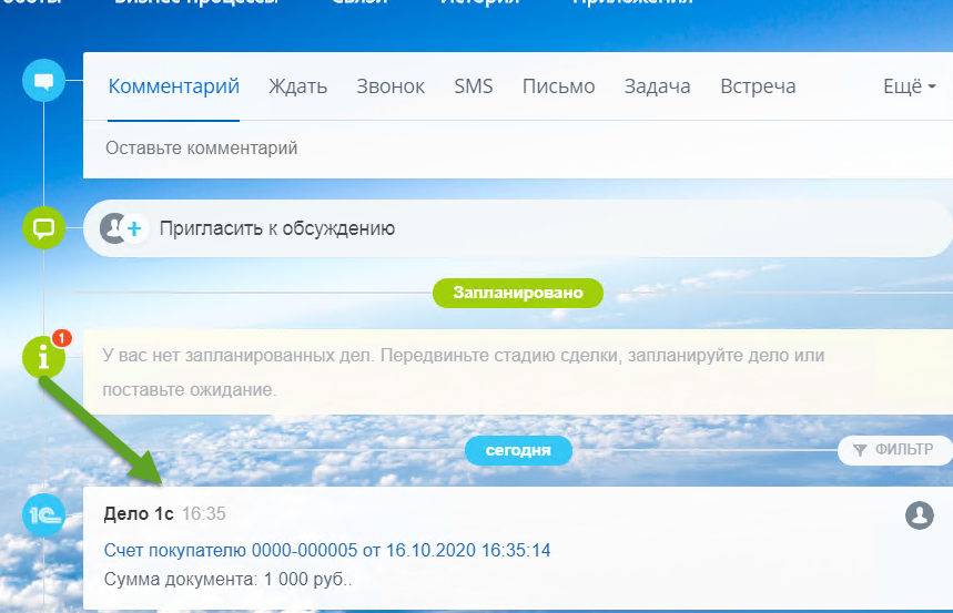Помимо этого, вы сможете отправлять в Битрикс24 уведомления о корректности документов, либо предупреждения об ошибках. Эти действия сохранятся в ленте активити Битрикс24 как Дела 1С.