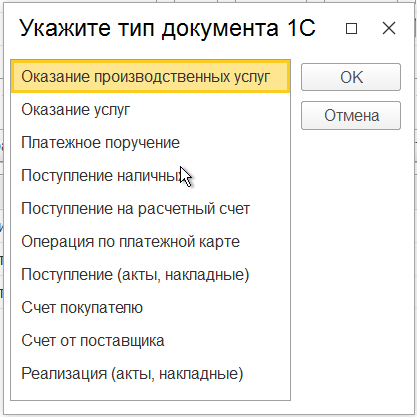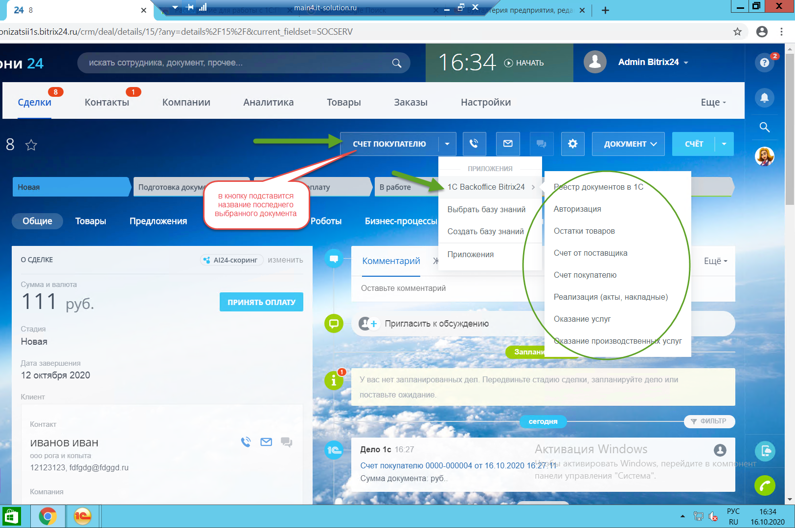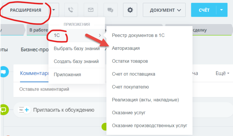После выполнения соответствующей настройки на стороне 1С в Битрикс24, вы сможете выбирать нужные документы из 1С, используя меню внури карточки CRM.