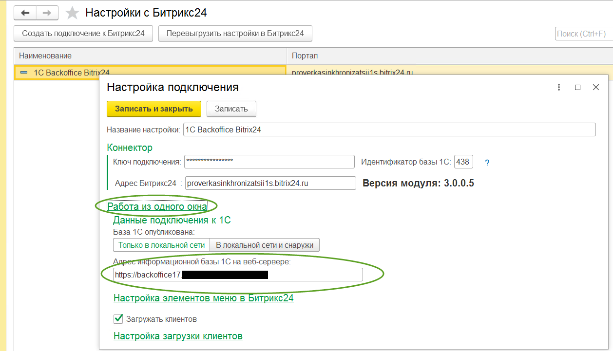 Теперь вернитесь в меню Настройки с Битрикс24 и откройте созданное вами подключение. В окне настроек добавится разворачиваемое меню Работа из одного окна. Там вы сможете задать web-адрес с ssl-сертификатом до базы 1С.