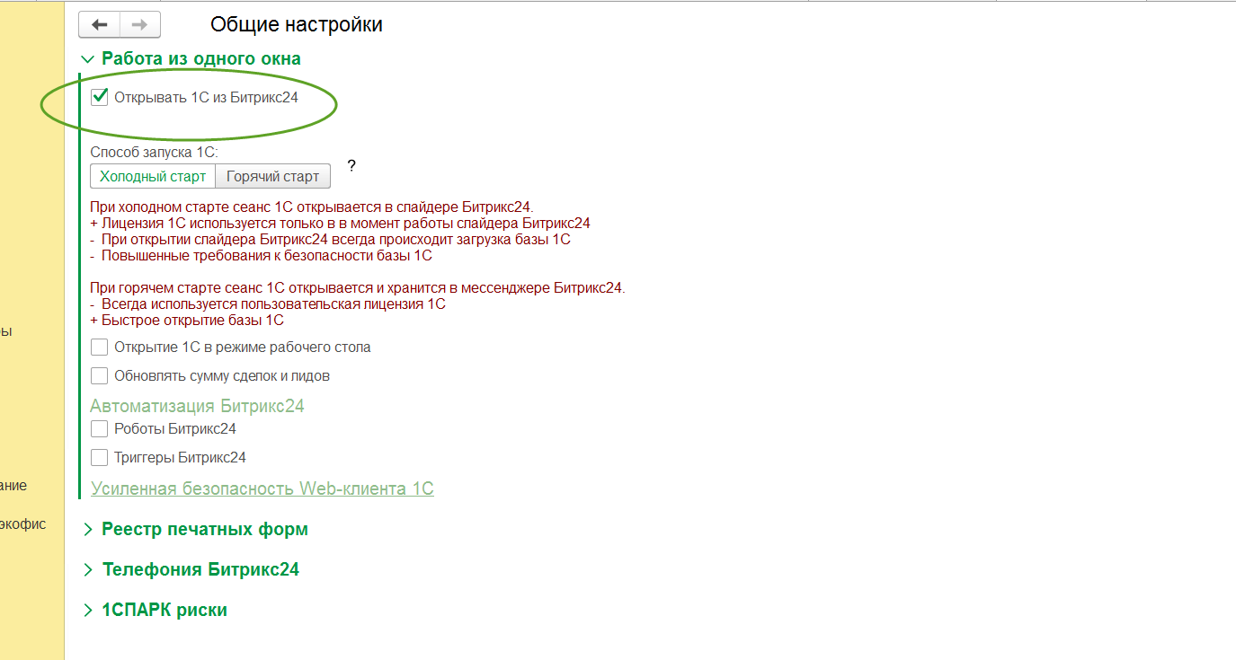 После этого вернитесь в раздел Битрикс24. 1С Бэкофис и выберите Общие настройки. Там нужно будет поставить галочку Открывать 1С из Битрик24.