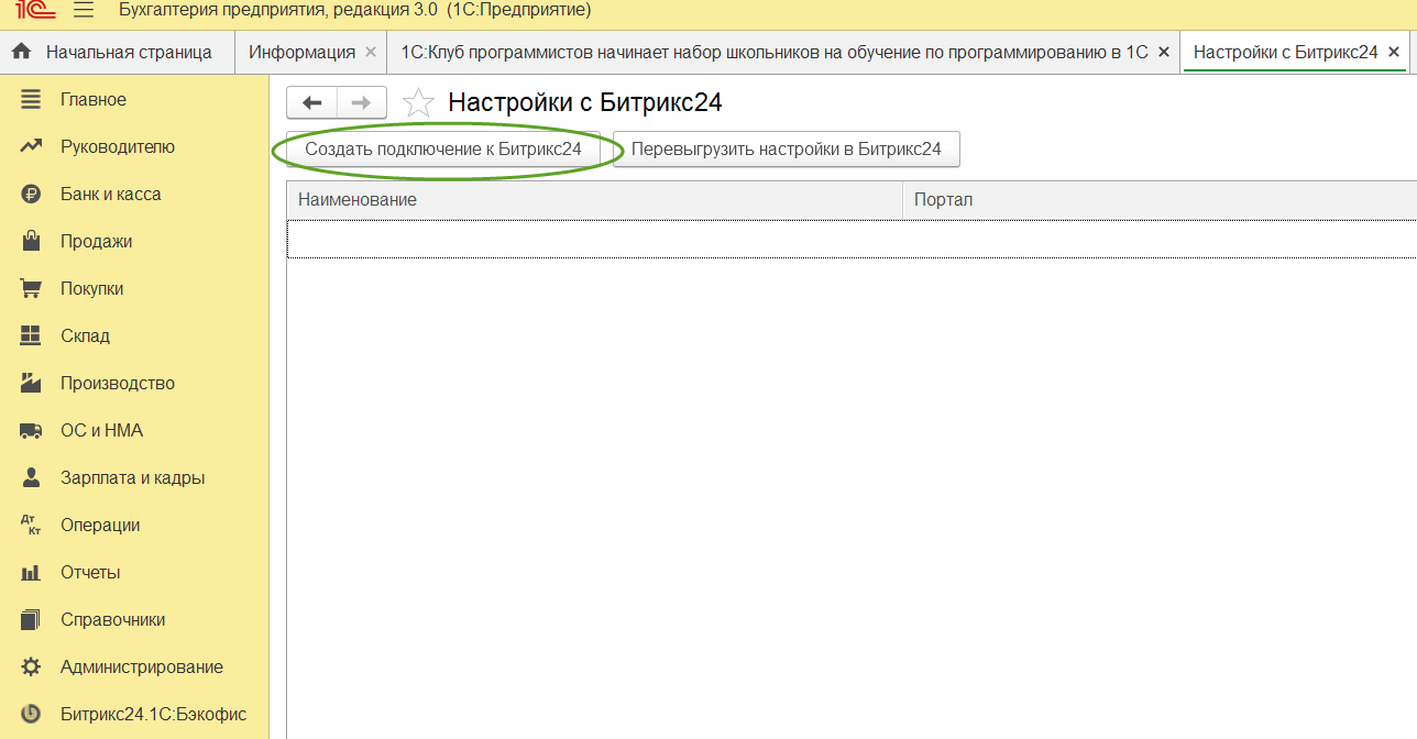 Перейдем к настройке модуля. Выберите раздел 1С: Бэкофис > Настройки с Битрикс24 и создайте новое подключение.