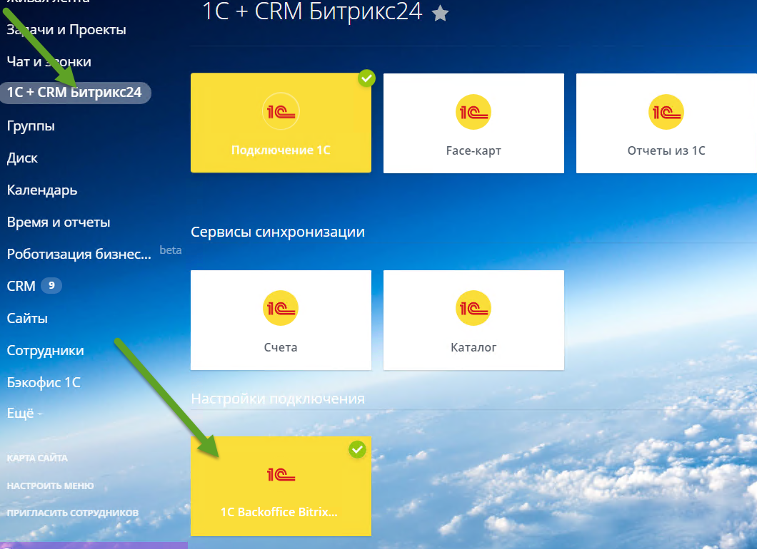 Для начала работы с модулем выберите в основном меню пункт 1C + CRM Битрикс24. Нас интересует раздел 1С Бэкофис.