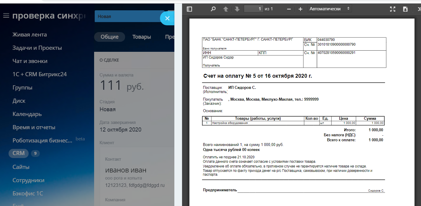 1С: Бэкофис – модуль, позволяющий работать с 1С ВНУТРИ Битрикс24 прямо из карточки CRM. При создании документов данные автоматически отобразятся в обеих системах.