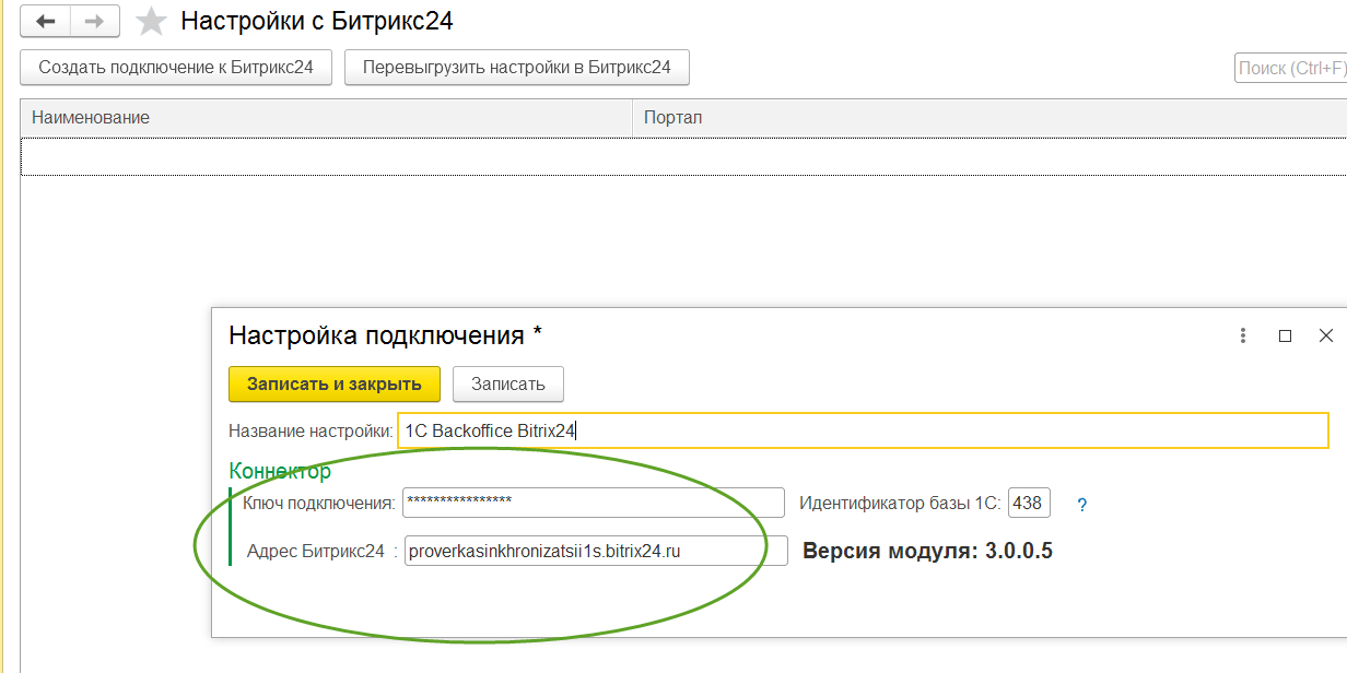 Далее введите название и вставьте в поле тот ключ, который вы ранее скопировали в разделе 1С + CRM Битрикс24. Адрес Битрикс24 определится автоматически.