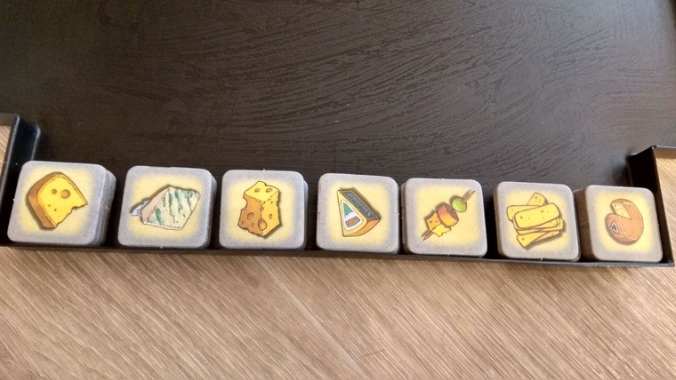 Жетоны сыра разделены на семь видов по четыре жетона, общим количеством двадцать восемь штук. Все они двухсторонние и выполнены из плотного и толстого картона хорошего качества. Тайлы игрового поля тоже выполнены из плотного и толстого картона, на них присутствуют изображения сыра, который также изображен на жетонах. Но тайлы игрового поля делятся на три вида: тайлы с изображением сыра, пустые тайлы и с отверстиями, в которые могут упасть мышата.
