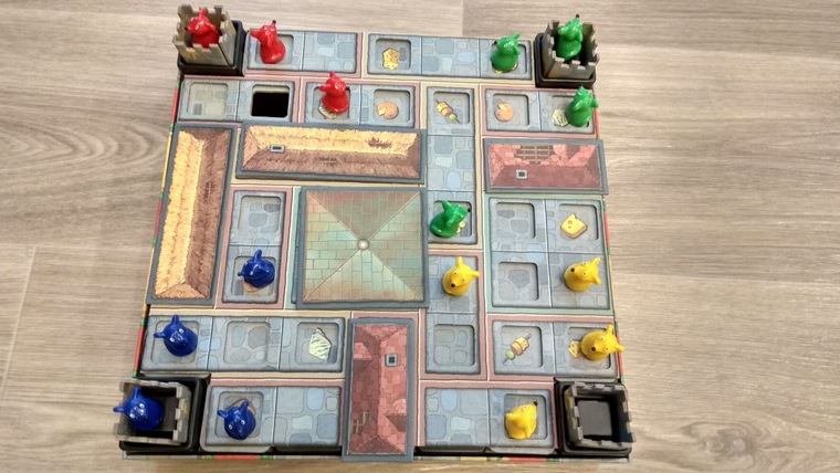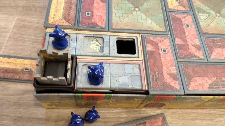 На каждой стене замка есть специальные метки-флаги, под которыми размещены отверстия для передвижения одной полоски игрового поля. Например, нужно переместить ближе клеточку с сыром или столкнуть противника в подвал. Чтобы сделать это, оставшийся тайл вставляется в специальное отверстие и до конца задвигается внутрь замка. С обратной стороны выпадет другой тайл. Воспользоваться этим шагом можно только раз в течение игры.