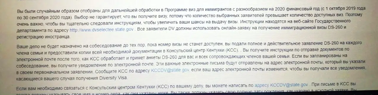 12 мая 2019 года мы узнали о том, что выиграли лотерею. Победной оказалась моя анкета. В сообщении было указано, что выигрыш в лотерею не гарантирует получения визы, потому что количество выбранных анкет превышает количество доступных виз. А также было указание следовать инструкциям на сайте Госдепа США.