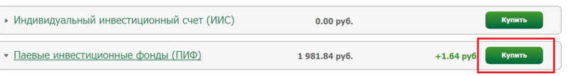 Если клиент Сбербанка не делал инвестиций, соответствующий раздел будет пуст и из него не получится купить ПИФы. Личный кабинет интернет-банкинга позволяет только докупать паи.