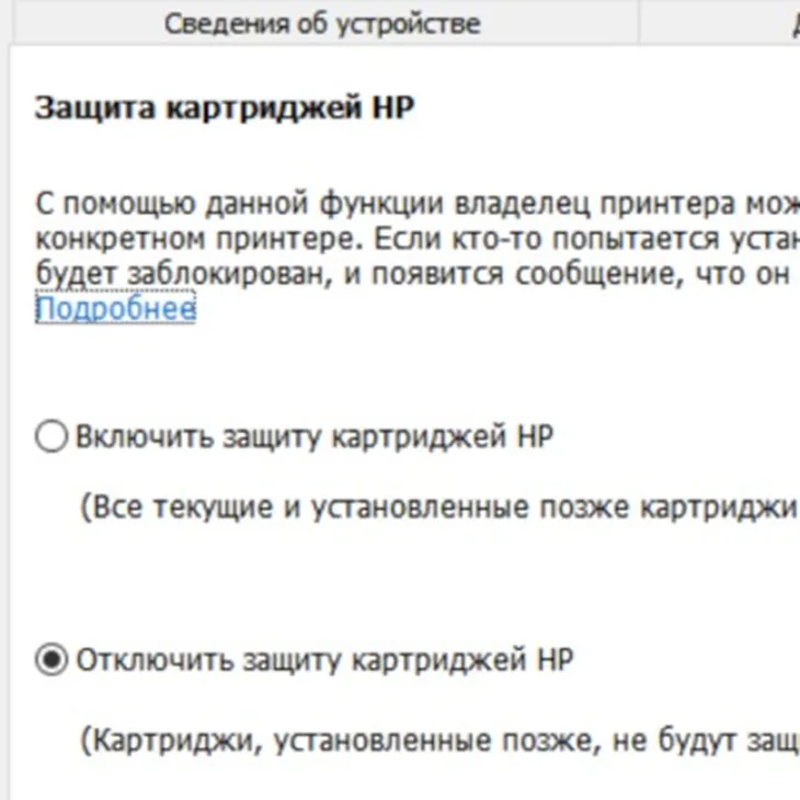 Отключение защиты картриджей HP