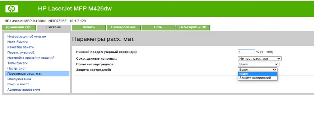 3.       Выберете вкладку «Система», в ней «Параметры расходных материалов». Пункт «Защита картриджей» выберете «Выкл».