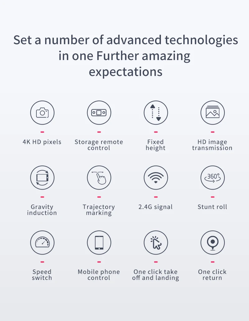 Функции: вверх/вниз, вперед/назад, влево/вправо, боковой F светильник, светодиодный светильник, Безголовый режим, автоматическая кнопка возврата, режим удержания высоты, Поворот на 360 °, wiFi FPV
