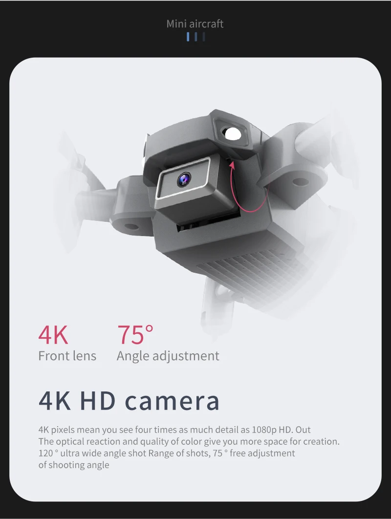 Фронтальные линзы устройства могут снимать под углом 75 градусов, а разрешение камеры 4K HD. Камера позволяет уловить мельчайшие детали, передав картинку в качестве на ваш смартфон. С помощью WiFi подключения можно передавать изображения в реальном времени.