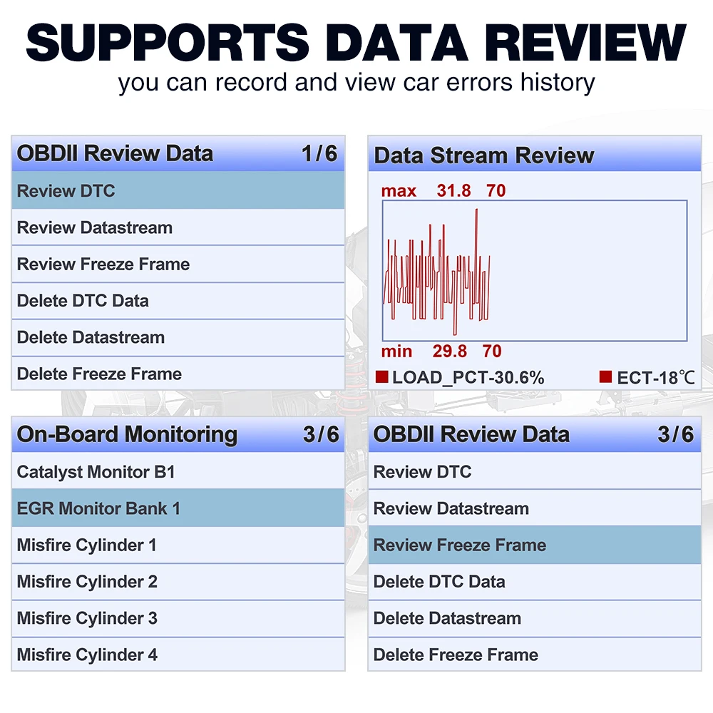 * Быстрый и простой доступ к функциям чтения и стирания кодов неисправностей (DTC)