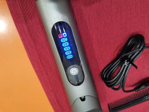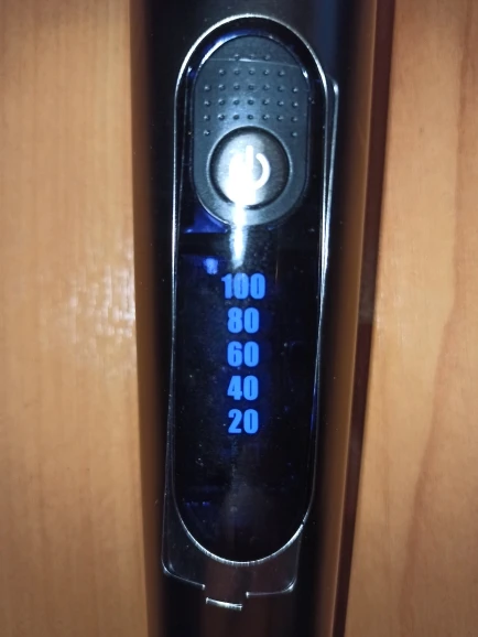 Машинка включается долгим нажатием на кнопку питания. На дисплее синим свечением отображается уровень заряда (100/80/60/40/20%)