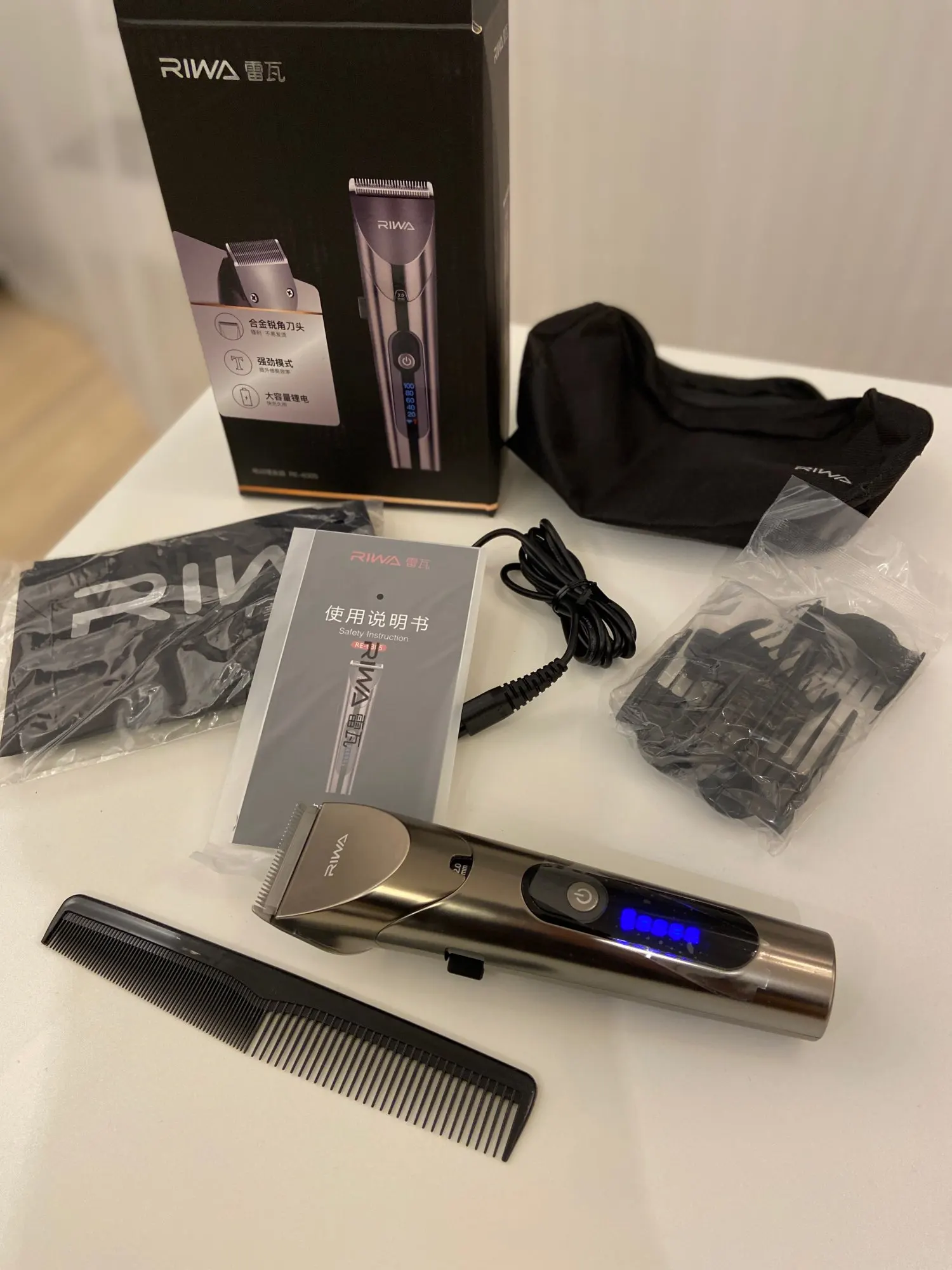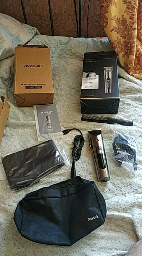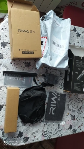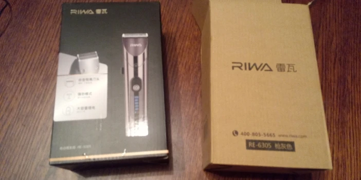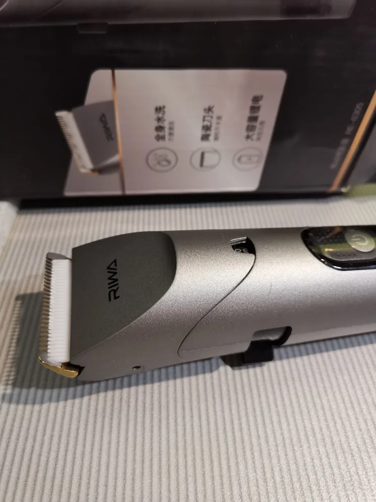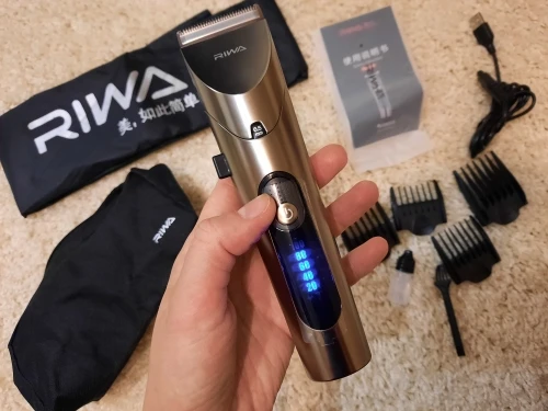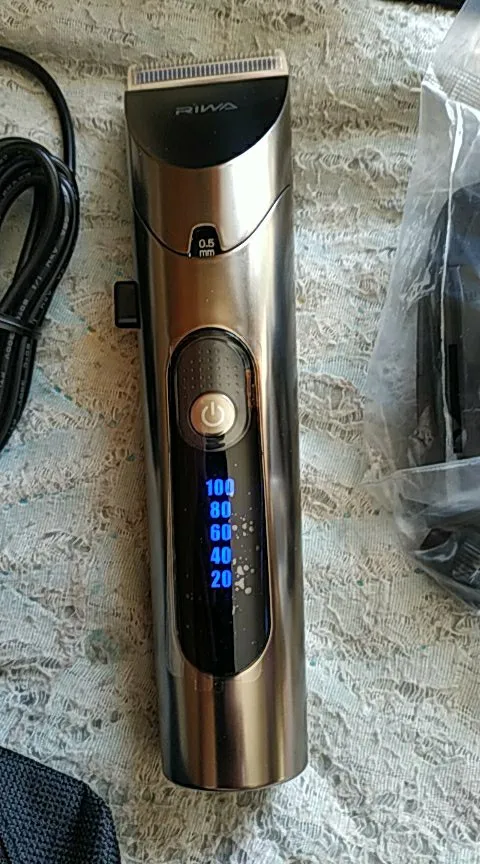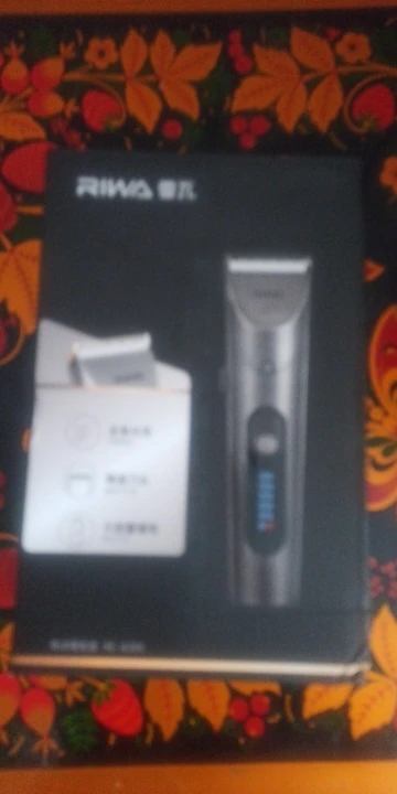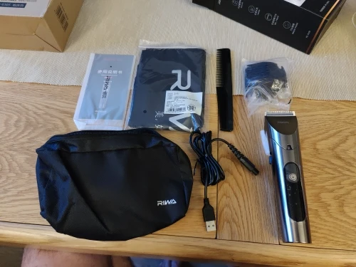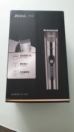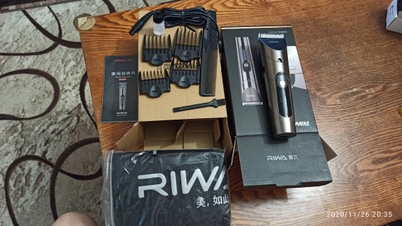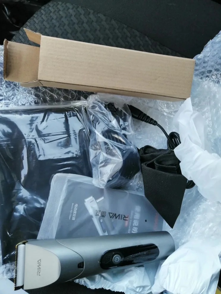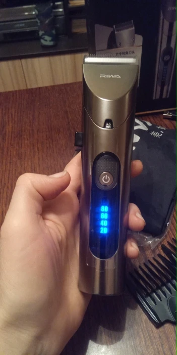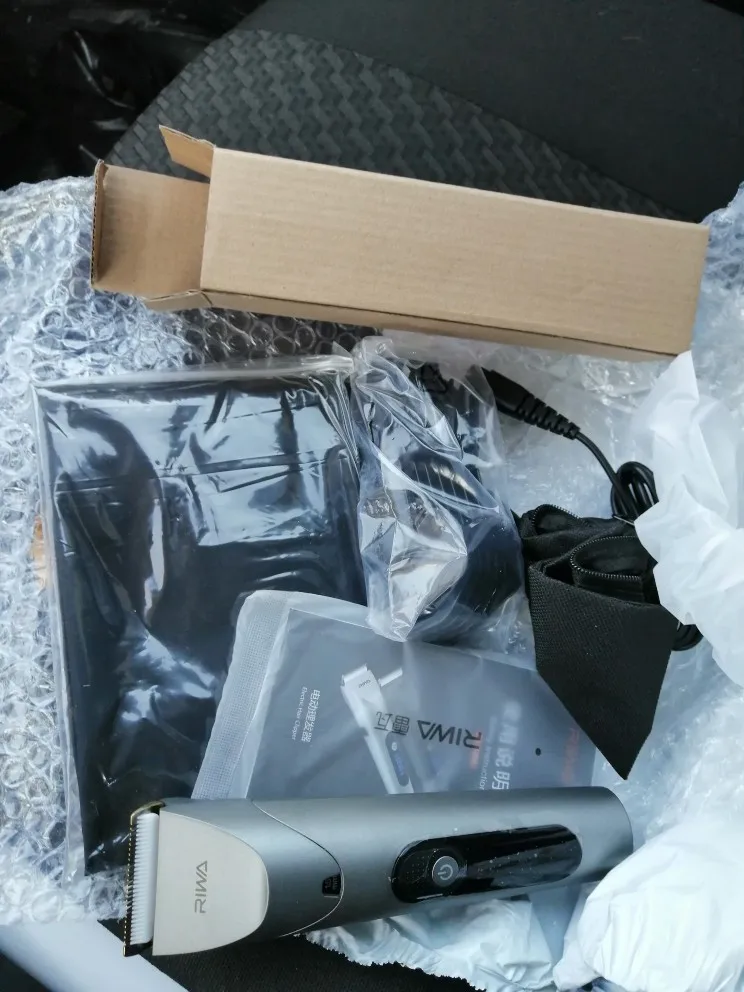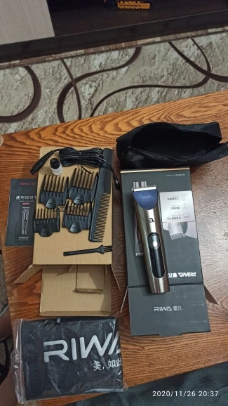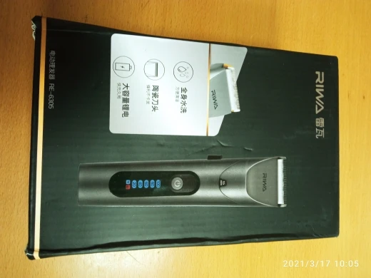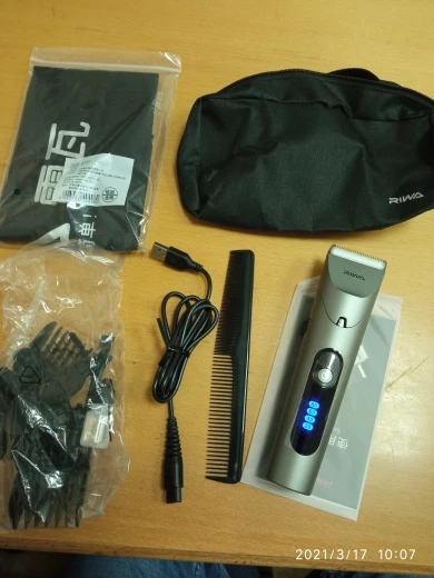 Нашел в упаковке сам Riwa K3, щетка, гребешок, зарядка, накидка и инструкцию на китайском языке. Сам триммер оказался упакован в еще одну картонную коробку. вместе с ним нашел гребешок и щетку. Машинка пришла заряженой, но батарея на дисплее уже мигала.