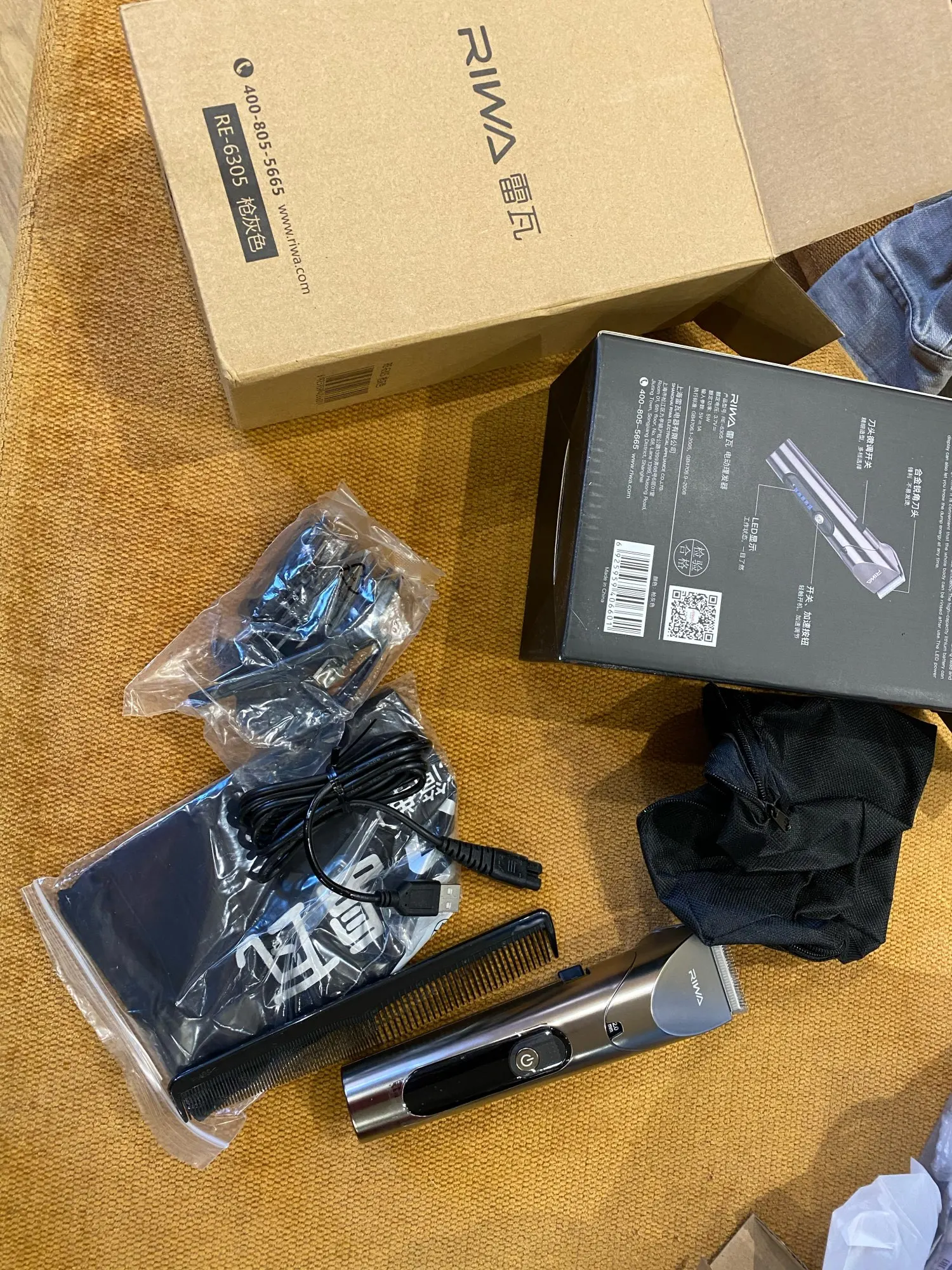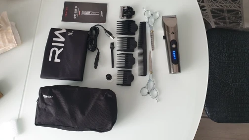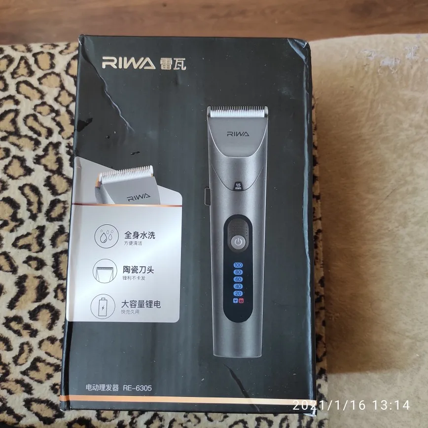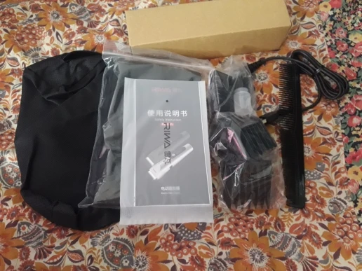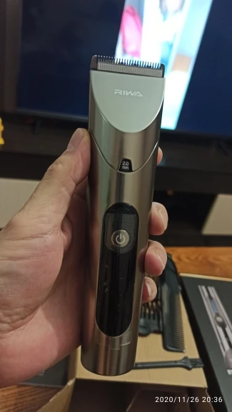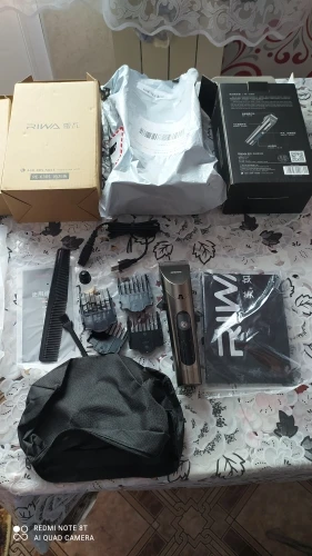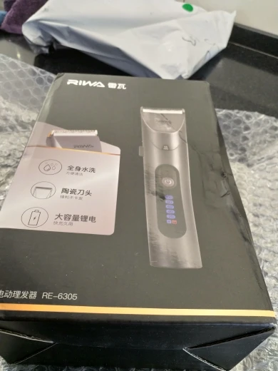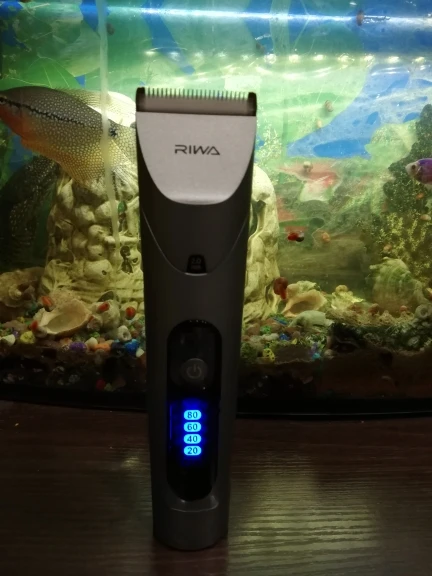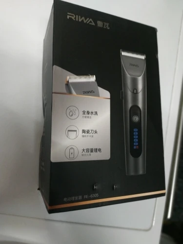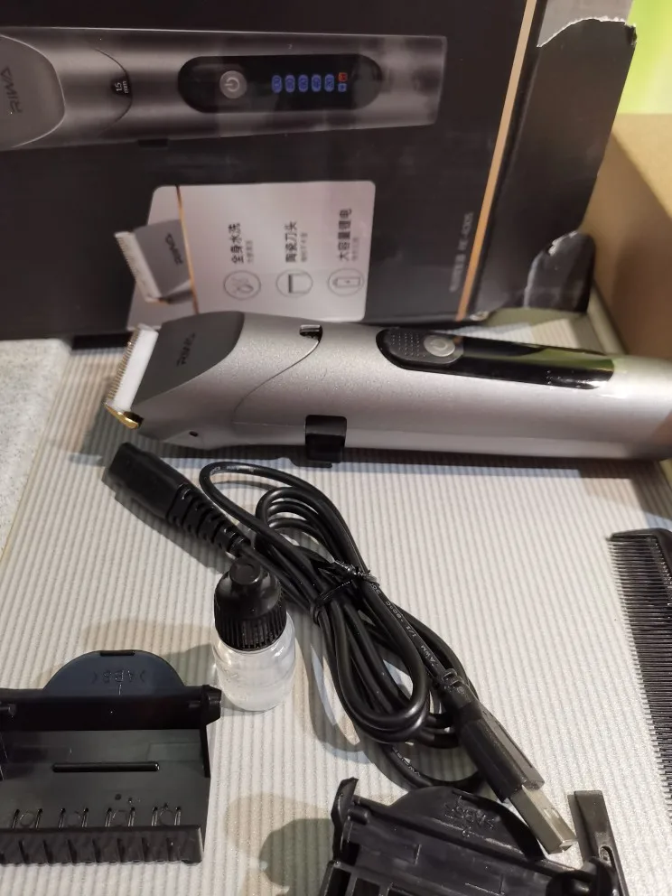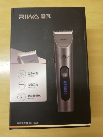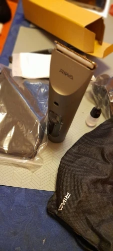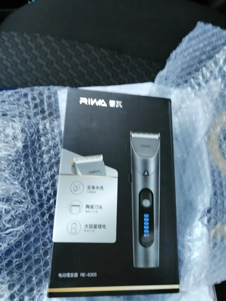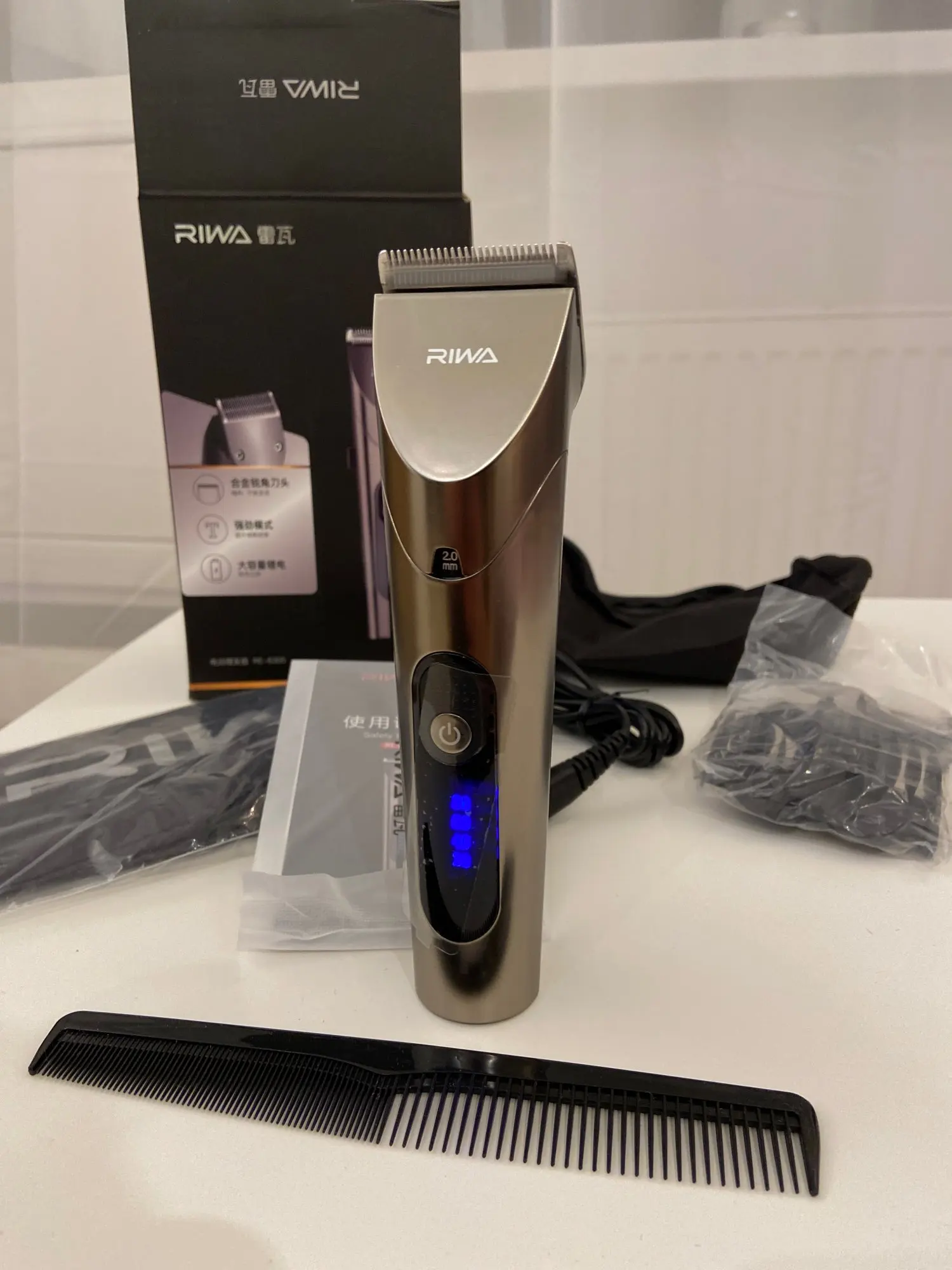 Нашел в упаковке сам Riwa K3, щетка, гребешок, зарядка, накидка и инструкцию на китайском языке. Сам триммер оказался упакован в еще одну картонную коробку. вместе с ним нашел гребешок и щетку. Машинка пришла заряженой, но батарея на дисплее уже мигала.