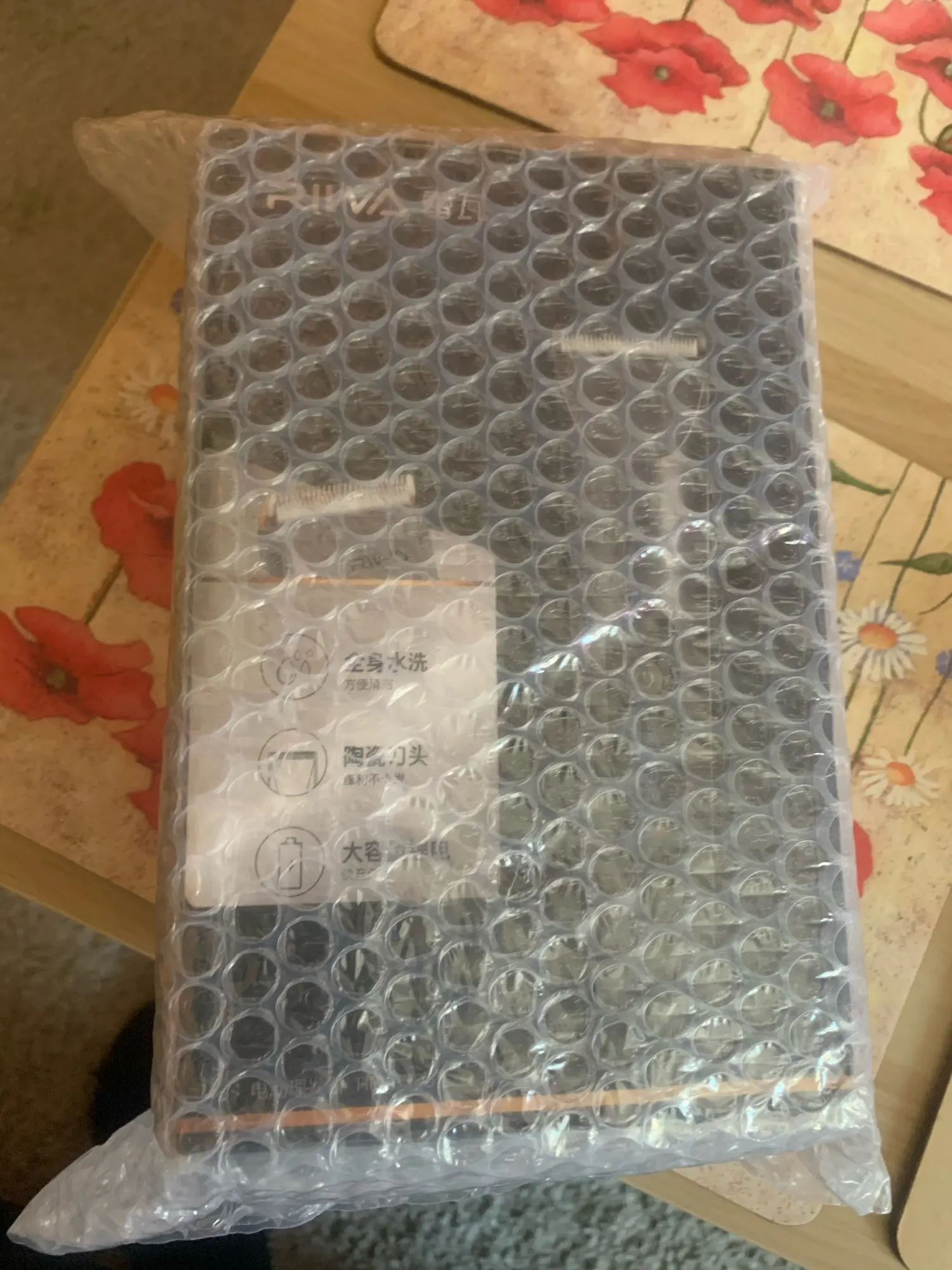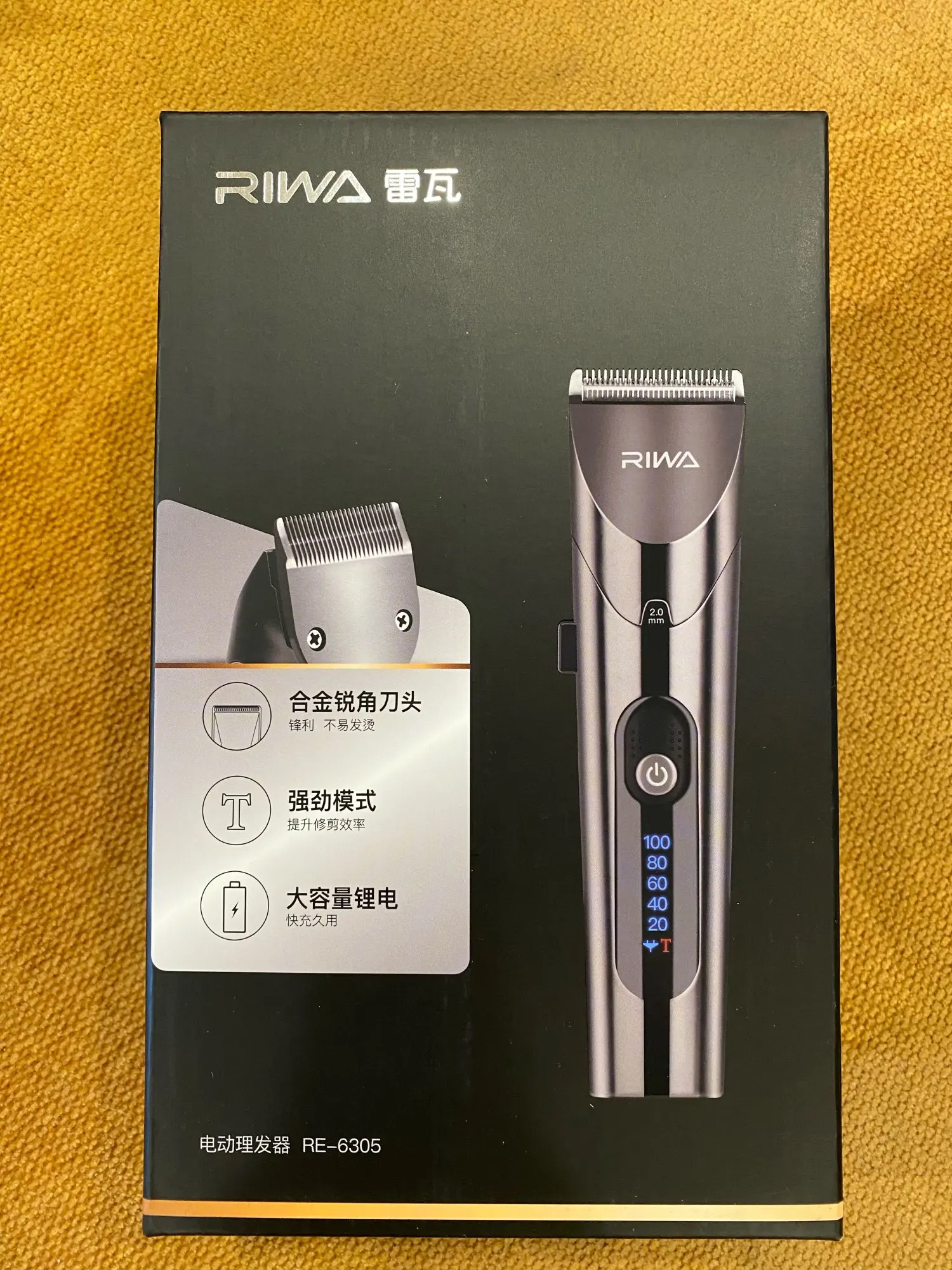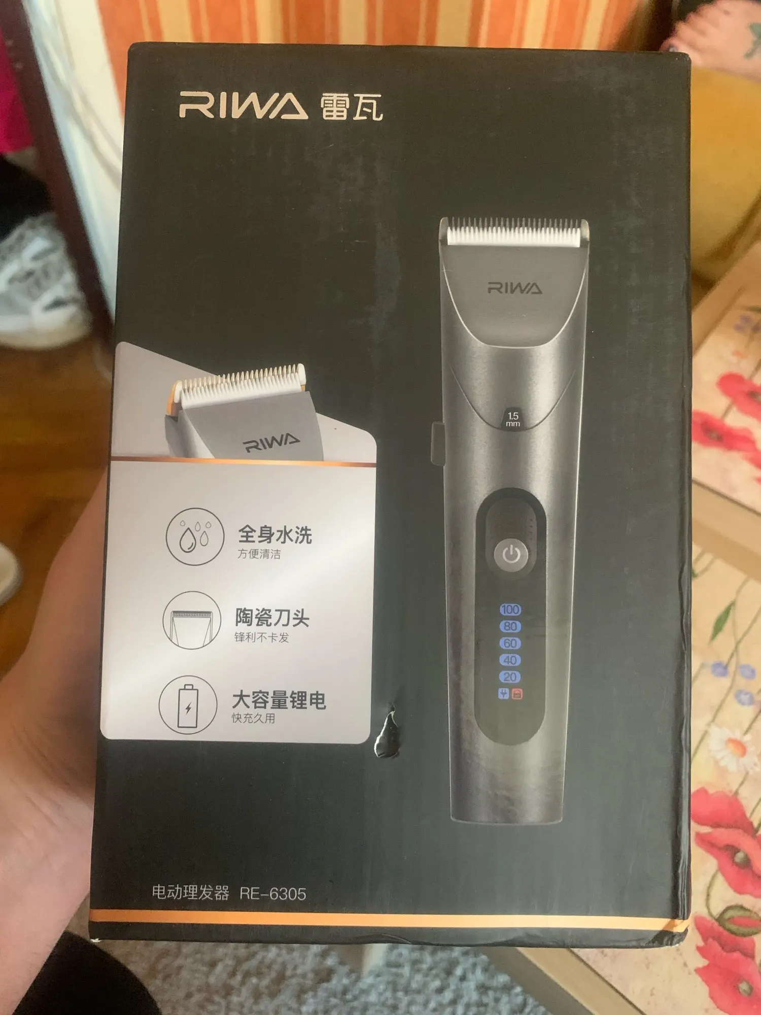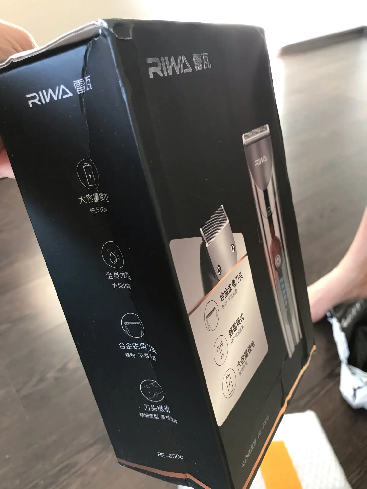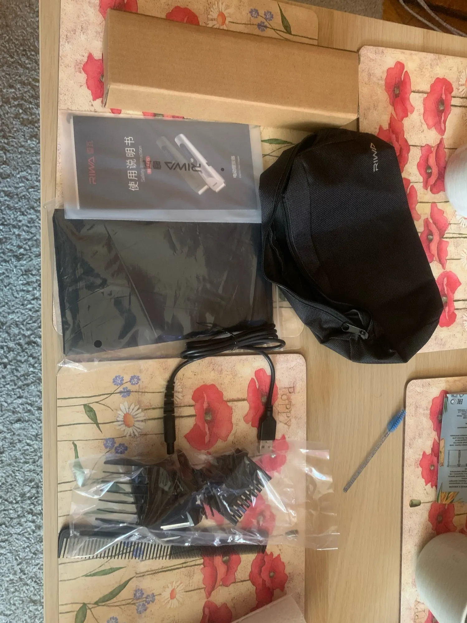 Нашел в упаковке сам Riwa K3, щетка, гребешок, зарядка, накидка и инструкцию на китайском языке. Сам триммер оказался упакован в еще одну картонную коробку. вместе с ним нашел гребешок и щетку. Машинка пришла заряженой, но батарея на дисплее уже мигала.