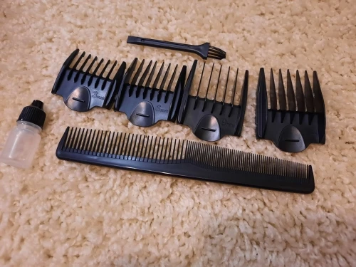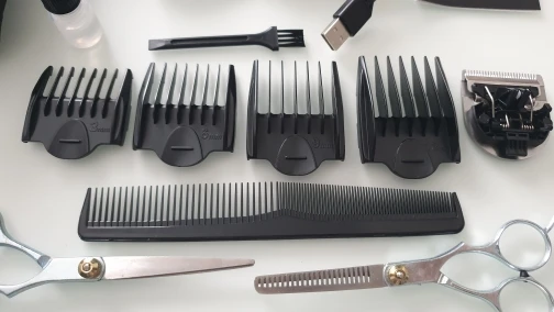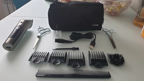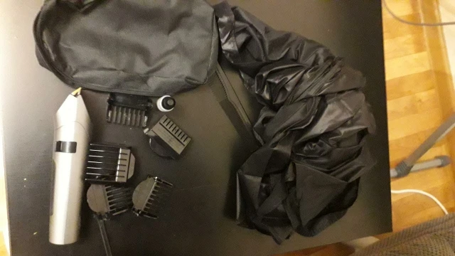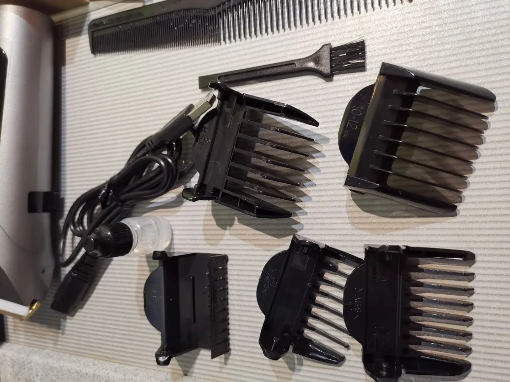 В стандартный набор входят: насадки на 3, 6, 9, 12 мм; USB-зарядный провод, масло для смазки лезвий и кисточка, отличный непромокаемый фартук (балдёж) для «клиента» (подопытного) и расчёска. Всё это упаковано в чехол.