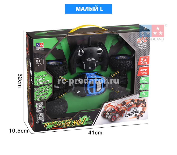Машинка-перевертыш производителя «Weishengda» предназначена для детей от 6 лет и имеет большой размер – 42х25х9,5 см (33×23.5×9,5 см в режиме внедорожника) и не имеет острых углов, которые могут травмировать ребенка. Автомобиль может ездить в разные стороны, и даже боком, и поворачиваться на 360°, а управление ими максимально упрощено.