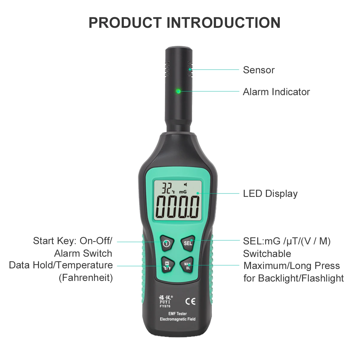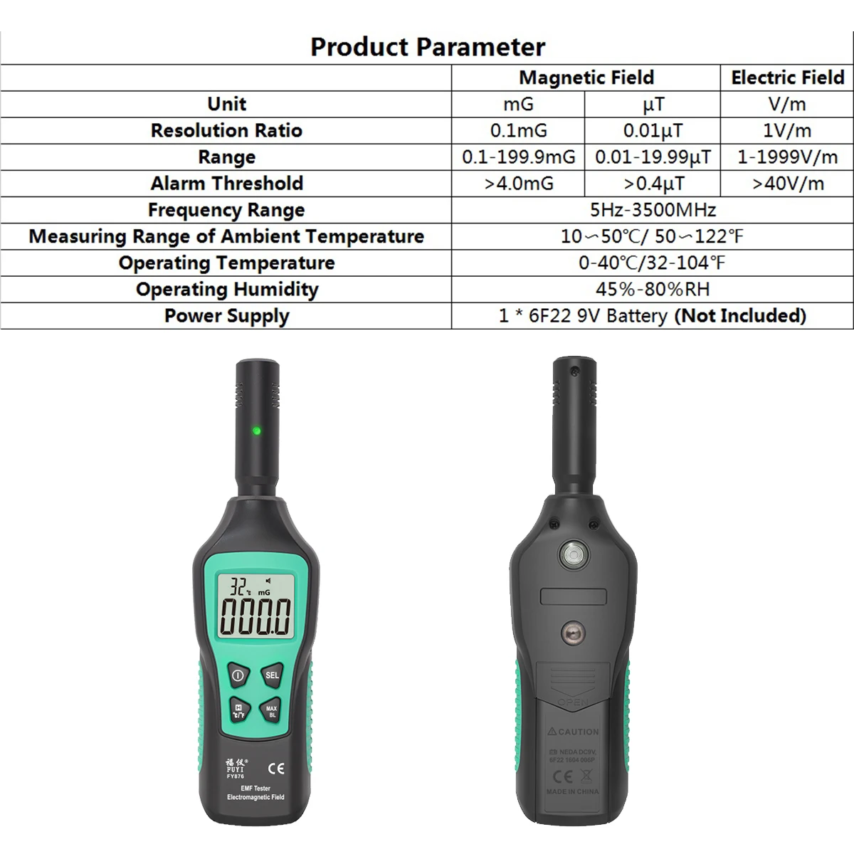 Измеритель электромагнитного излучения EMF и температуры FUYI FY876 с выносным измерительным датчиком и LCD – позволяет измерять электромагнитное излучение электрических приборов. Данный детектор применяется в быту и в промышленности для контроля за уровнем электромагнитного излучения вокруг электроприборов, линий электропередач, бытовой техники или промышленного оборудования. Особенностью прибора можно назвать измерительный датчик, вынесенный из корпуса и хорошую чувствительность.