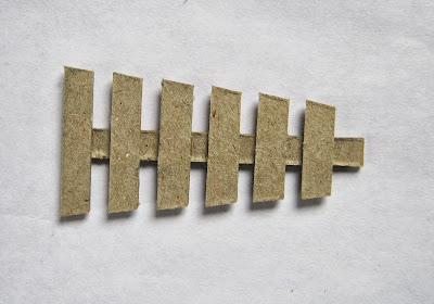 Отдельно вырезаем полосы из картона длиной 6 см., ширина 5мм. Это будет основа лопасти. Каждый клинышек разрезаем на полоски по 5 мм. и начинаем приклеивать их (тоже на момент-кристалл) на основу, от самой длинной к самой короткой. Расстояние между дощечками примерно 3 мм. Получается вот так: