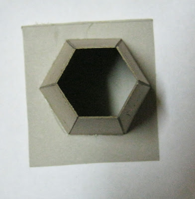 Затем берём небольшой квадрат из картона, делаем основу мельницы. Заодно это уравновесит всю конструкцию и закрепит её. Для этого промазываем торец мельницы глосси (мне кажется так более прочно)) и приклеиваем на картон, при этом стараемся, чтобы получился ровный шестиугольник) Вид сверху: