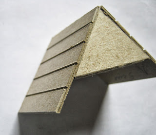 Крышу сделала из полосок гофрокартона (только гофра без нижней и верхней части). Наклеила «в нахлёст» на заготовленную заранее картонку вырезанную под размер и согнутую пополам. Верхняя полоска немного находит на нижний. Получилась неплохая имитация черепицы.