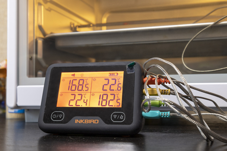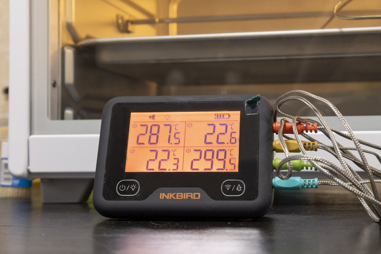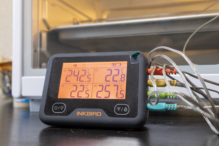 Фактическая максимальная температура в камере при верхнем и нижнем нагреве постепенно подбирается к 300°C и даже превышает эту отметку. Для тестов использовались два термощупа, находящихся на противне в середине камеры.
