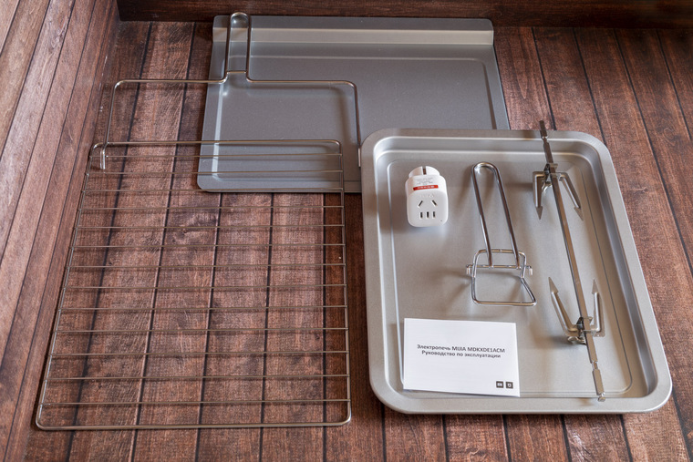 Комплектацию вполне можно назвать богатой — помимо стандартного противня с внутренними размерами 31.5 x 24 см и хромированной решётки (общие размеры 35 x 28 см, вес — 194 гр.) в неё включили тонкий поддон для крошек, вертел с вилками и винтами, а ещё ухваты для противня и вертела.